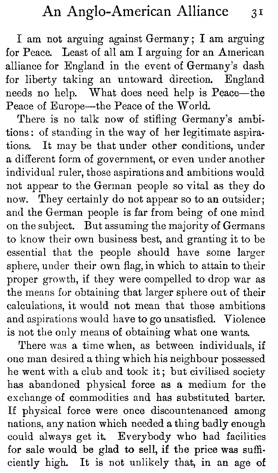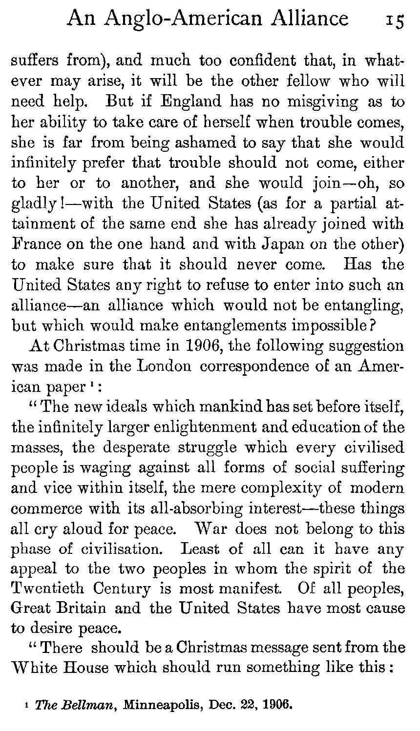 | The Avoidance of Entangling Alliances—What the Injunction Meant—What it Cannot Mean To-day—The Interests of the United States, no less than those of England, Demand an Alliance—But Larger Interests than those of the Two Peoples are Involved—American Responsiveness to Ideals—The Greatest Ideal of All, Universal Peace: the Practicability of its Attainment—America's Responsibility—Misconceptions of the British Empire—Germany's Position—American Susceptibilities. | |