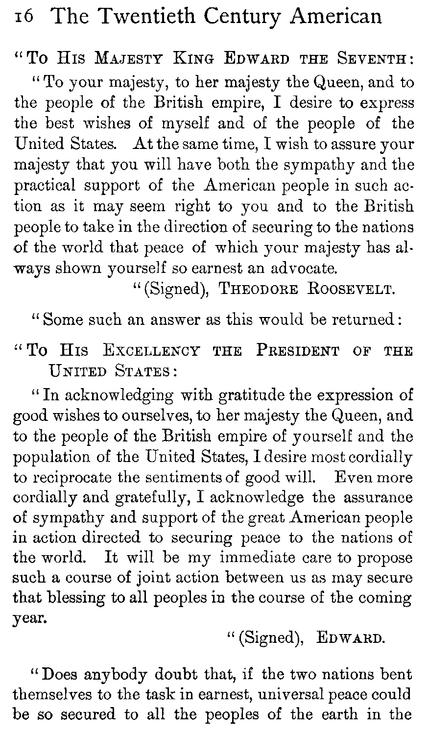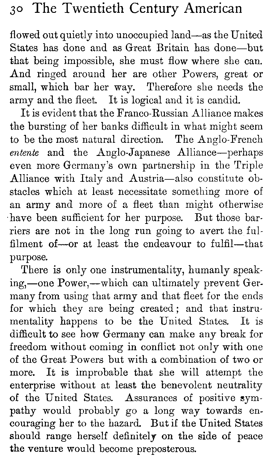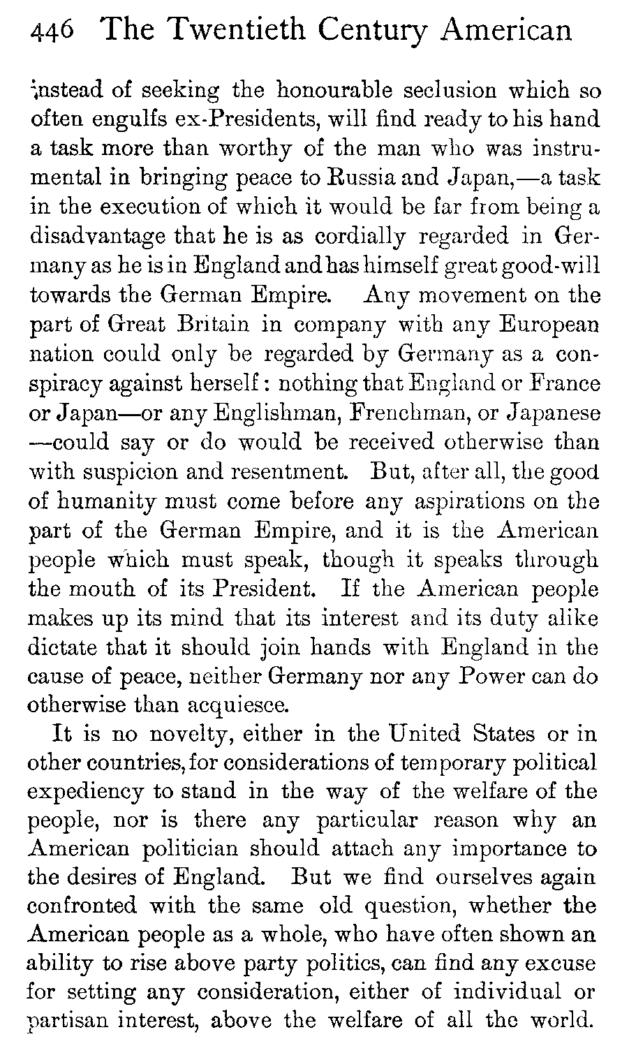 In such a cause there is one man in America to whom one's thoughts of necessity turn; and he is hampered by being President of the United States. Perhaps when his present term of office is over Mr. Roosevelt, [446]instead of seeking the honourable seclusion which so often engulfs ex-Presidents, will find ready to his hand a task more than worthy of the man who was instrumental in bringing peace to Russia and Japan,—a task in the execution of which it would be far from being a disadvantage that he is as cordially regarded in Germany as he is in England and has himself great good-will towards the German Empire. Any movement on the part of Great Britain in company with any European nation could only be regarded by Germany as a conspiracy against herself: nothing that England or France or Japan—or any Englishman, Frenchman, or Japanese—could say or do would be received otherwise than with suspicion and resentment. But, after all, the good of humanity must come before any aspirations on the part of the German Empire, and it is the American people which must speak, though it speaks through the mouth of its President. If the American people makes up its mind that its interest and its duty alike dictate that it should join hands with England in the cause of peace, neither Germany nor any Power can do otherwise than acquiesce.