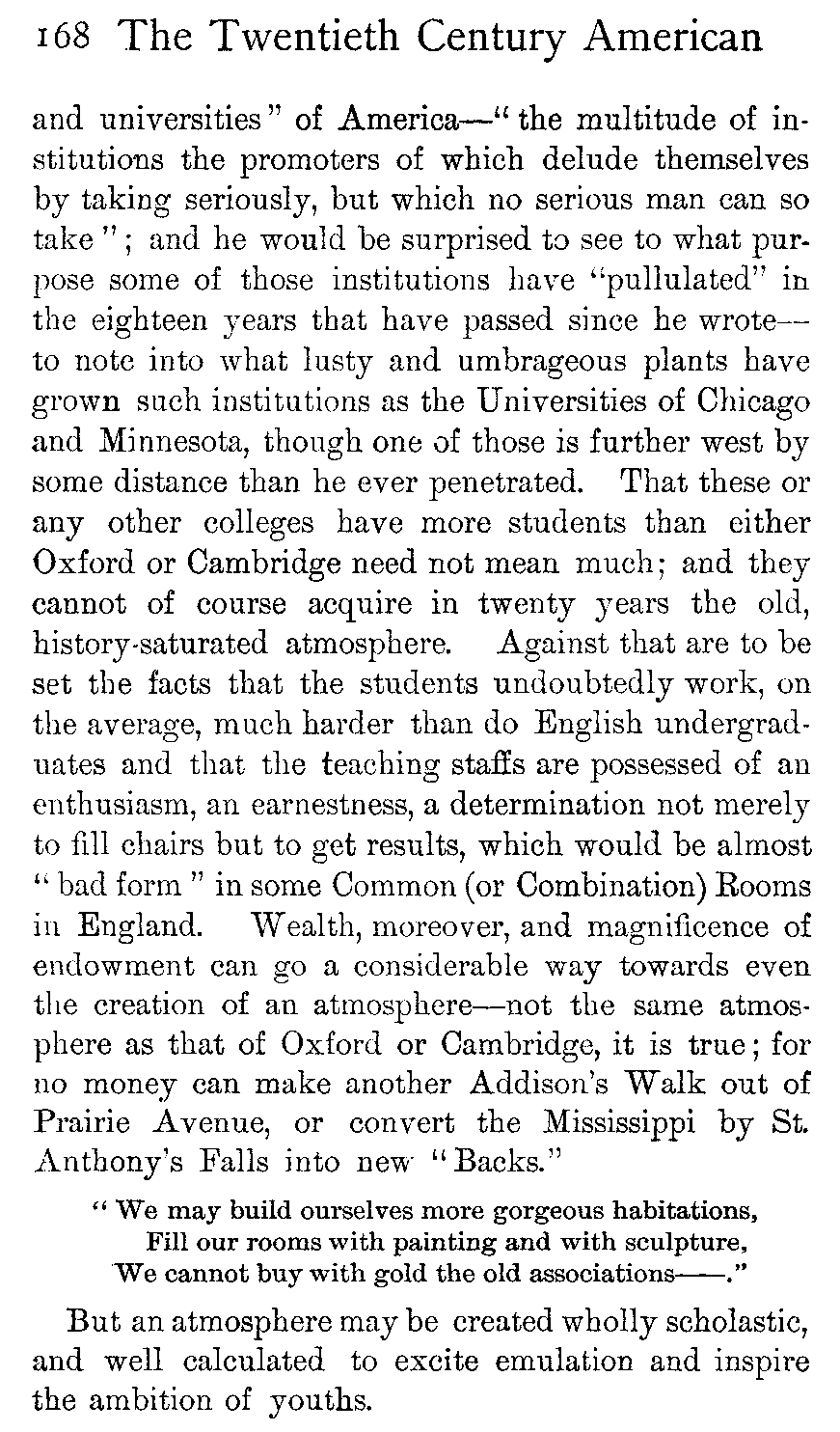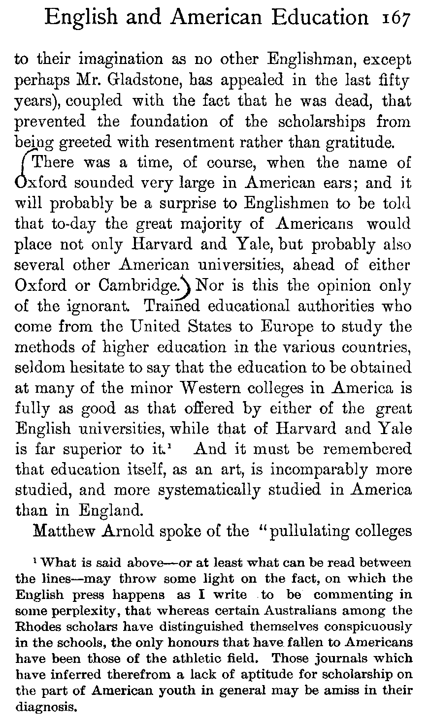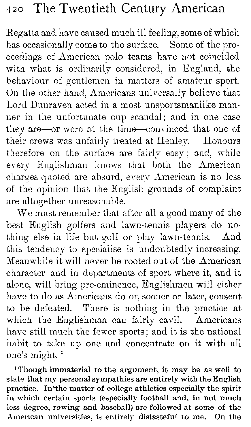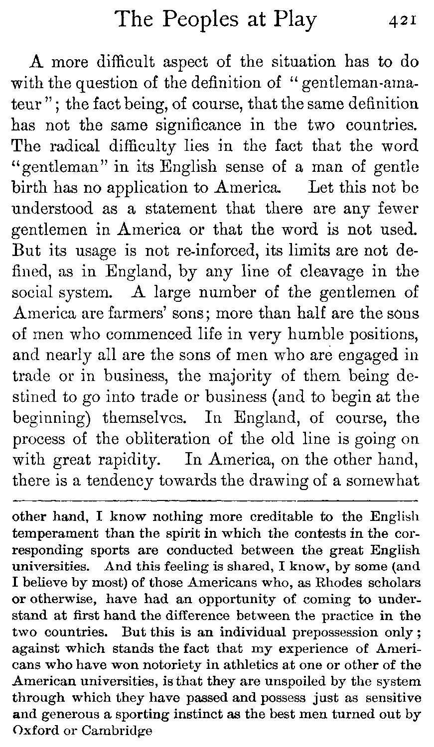 [420:1] Though immaterial to the argument, it may be as well to state that my personal sympathies are entirely with the English practice. In the matter of college athletics especially the spirit in which certain sports (especially football and, in not much less degree, rowing and baseball) are followed at some of the American universities, is entirely distasteful to me. On the other hand, I know nothing more creditable to the English temperament than the spirit in which the contests in the corresponding sports are conducted between the great English universities. And this feeling is shared, I know, by some (and I believe by most) of those Americans who, as Rhodes scholars or otherwise, have had an opportunity of coming to understand at first hand the difference between the practice in the two countries. But this is an individual prepossession only; against which stands the fact that my experience of Americans who have won notoriety in athletics at one or other of the American universities, is that they are unspoiled by the system through which they have passed and possess just as sensitive and generous a sporting instinct as the best men turned out by Oxford or Cambridge.
