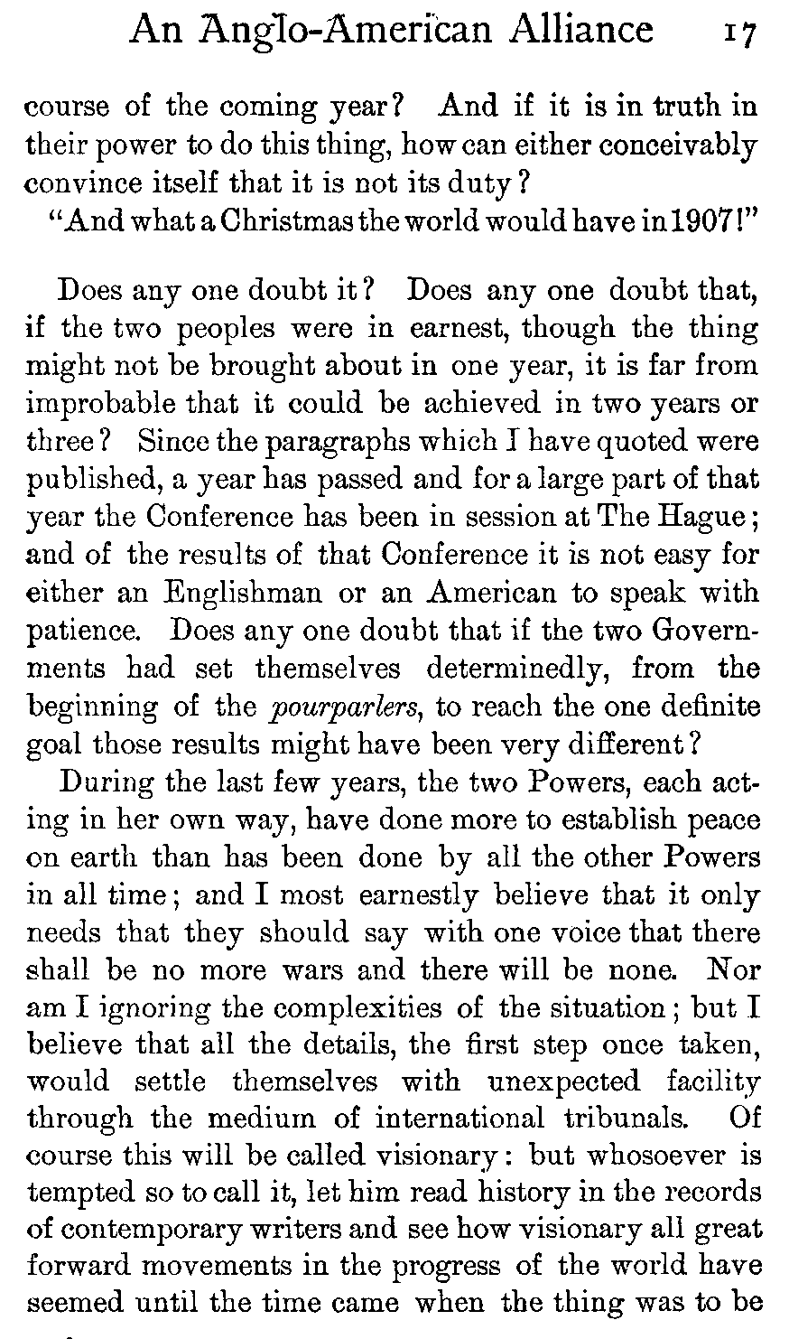 But beyond all this—apart from, and vastly greater than, the considerations of the interest or the security of either Great Britain or the United States—is the claim of humanity. The two peoples have it in their hands to give to the whole world no less a gift than that of Universal and Perpetual Peace. It involves no self-sacrifice, the giving of this wonderful boon, for the two peoples themselves would share in the benefit no less than other peoples, and they would be the richer by the giving. It involves hardly any effort, for they have but to hold out their hands together and give. It matters not that the world has not appealed to them. The fact remains that they can do this thing and they alone; and it is for them to ask their own consciences whether any considerations of pride, any prejudice, any absorption in their own affairs—any consideration actual or conceivable—can justify them in holding back. Still more does it rest with the American people—usually so quick to respond to high ideals—to ask its conscience whether any consideration, actual or conceivable, can justify it in refusal when Great Britain is willing—anxious—to do her share.