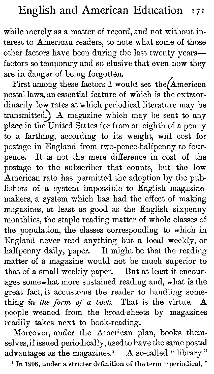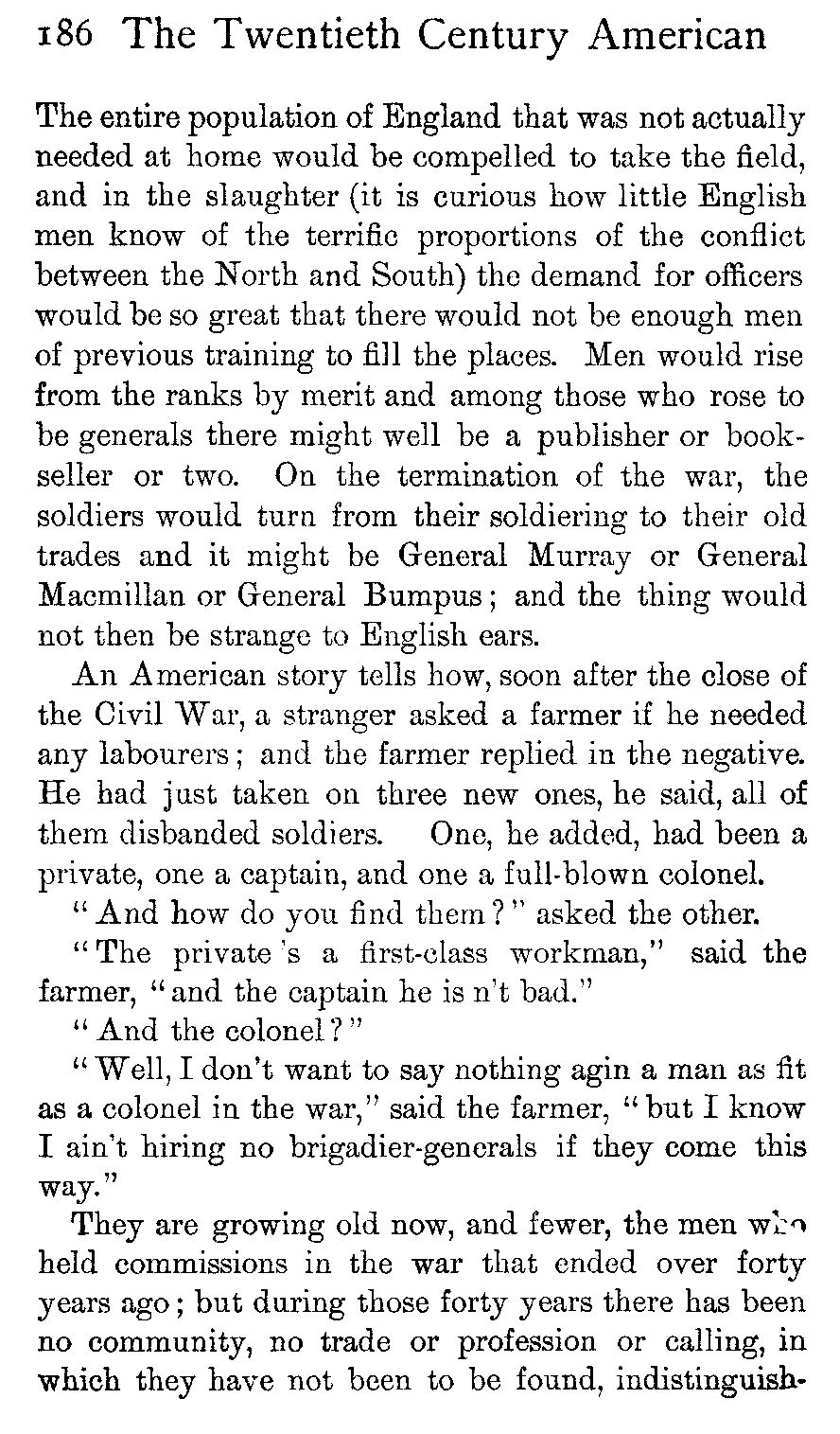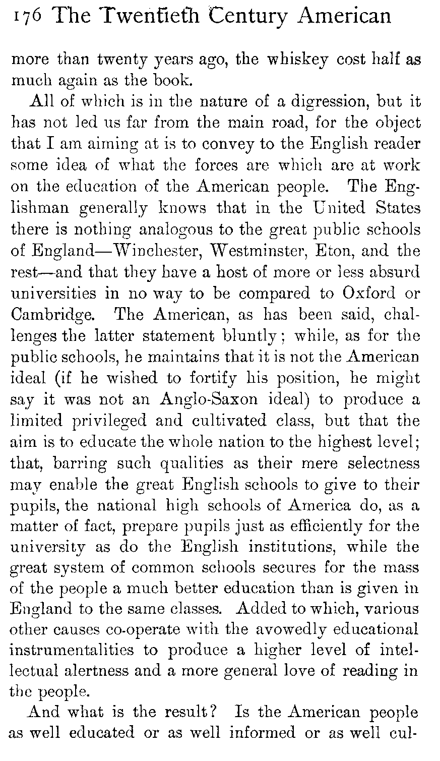 The Rhodes Scholarships—"Pullulating Colleges"—Are American Colleges Superior to Oxford or Cambridge?—Other Educational Forces—The Postal Laws—Ten-cent Magazines and Cheap Books—Pigs in Chicago—The Press of England and America Compared—Mixed Society—Educated Women—Generals as Booksellers—And as Farmhands—The Value of War to a People. |