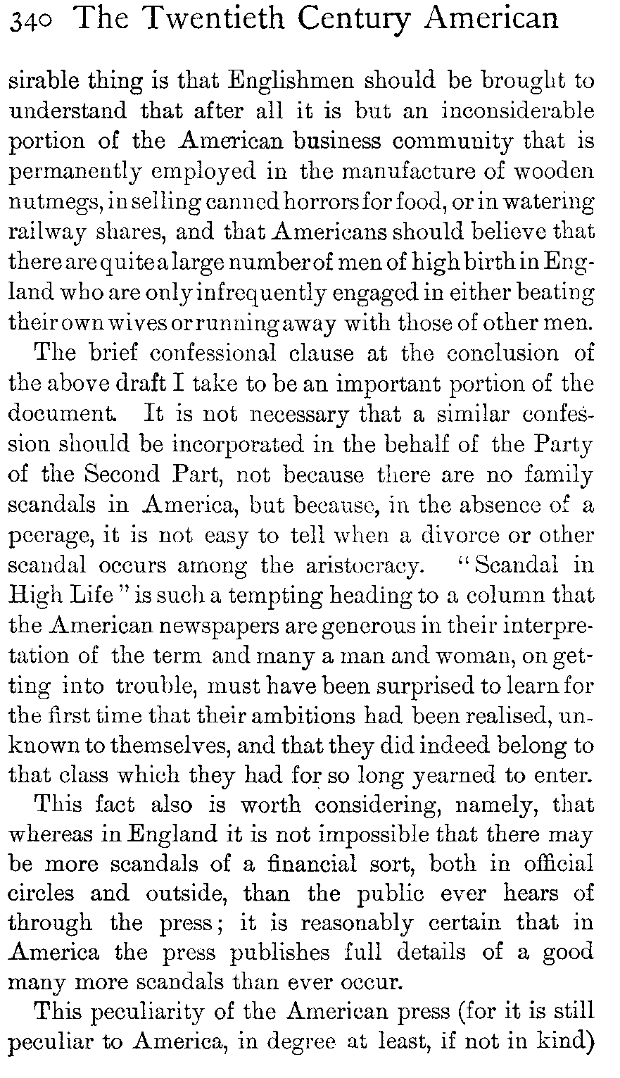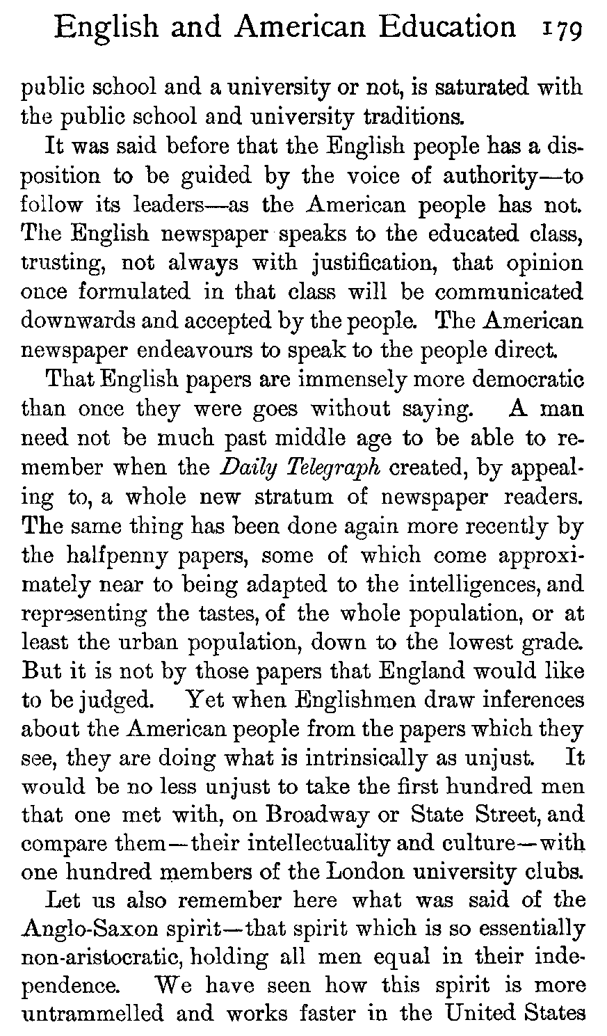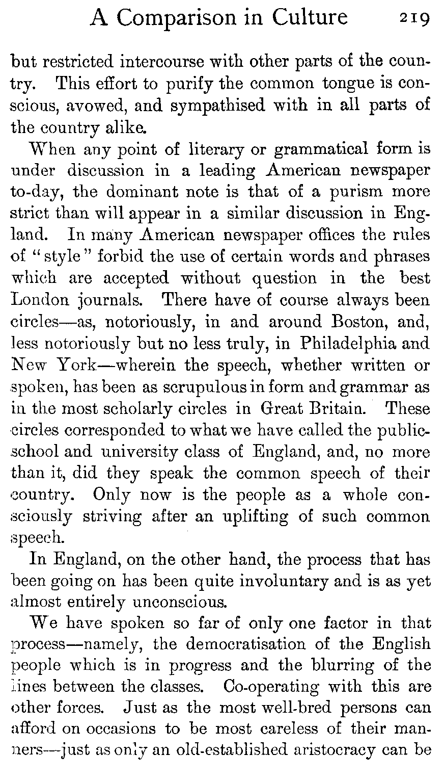 Finally Englishmen read American newspapers and, not understanding the different relation in which those newspapers stand to the people, they compare with them the normal English papers and draw inferences which are quite unjust. Similar inferences no less unjust may be drawn from hearing the speech of a certain number of well-to-do Americans, belonging, as Englishmen opine, to the class of "gentlemen."