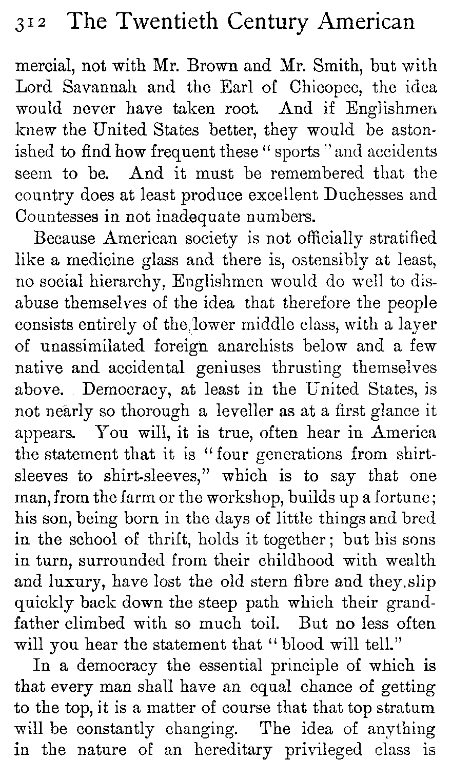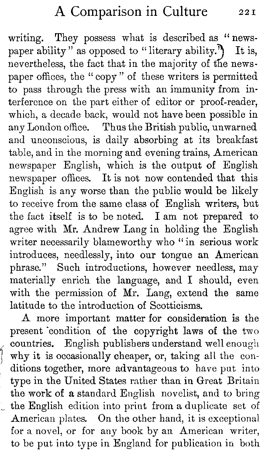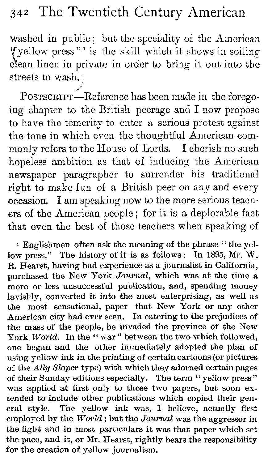Finally Englishmen read American newspapers and, not understanding the different relation in which those newspapers stand to the people, they compare with them the normal English papers and draw inferences which are quite unjust. Similar inferences no less unjust may be drawn from hearing the speech of a certain number of well-to-do Americans, belonging, as Englishmen opine, to the class of "gentlemen."