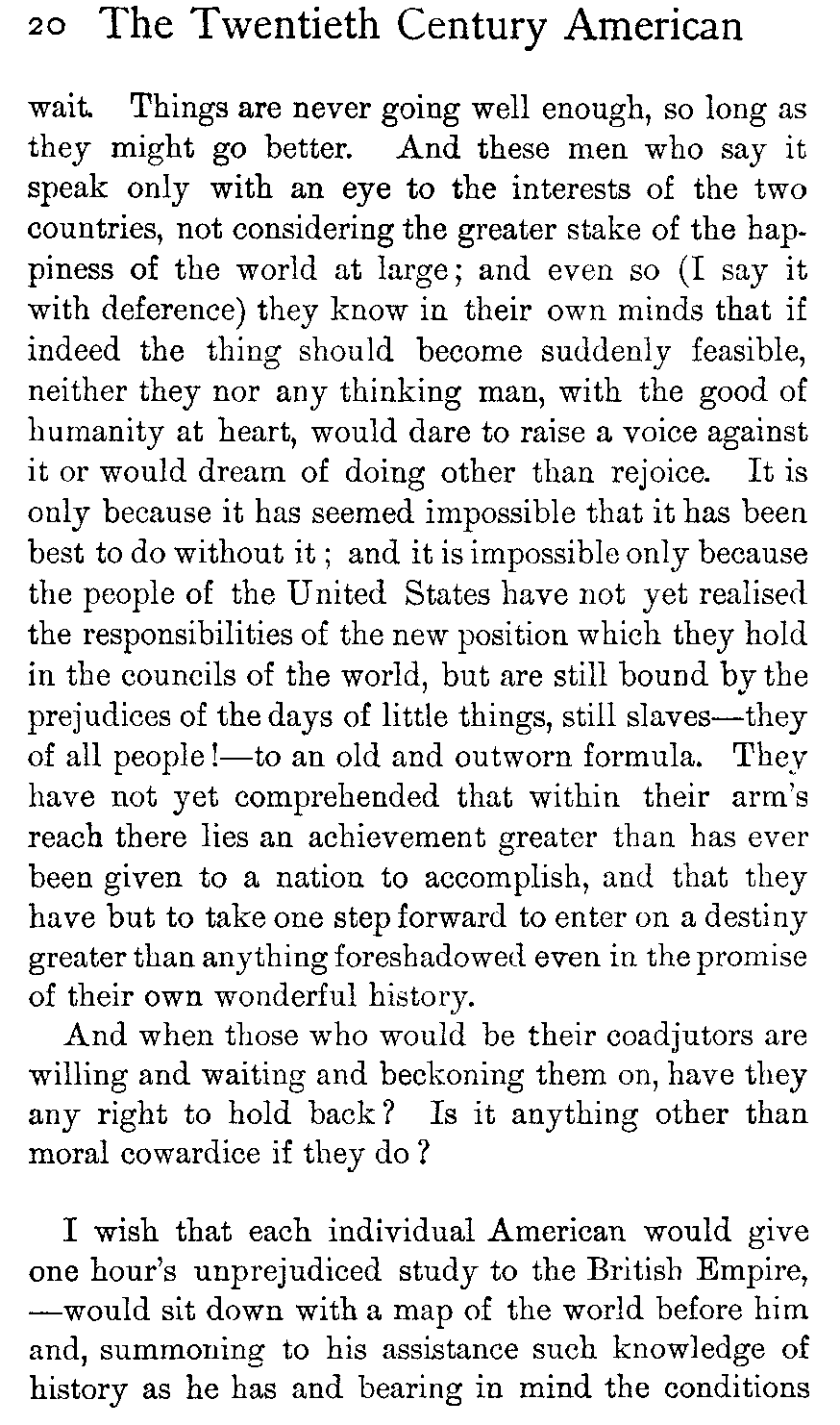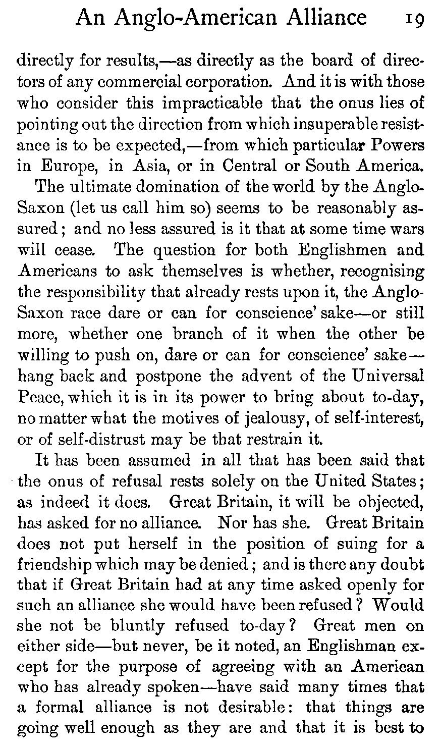 What is needed is that these two peoples holding, with similar steadfastness, to the same high ideals, pushing on such closely parallel lines in advance of all other peoples, should come to see more clearly how near of kin they are and how much the world loses by any lack of unison in their effort.
