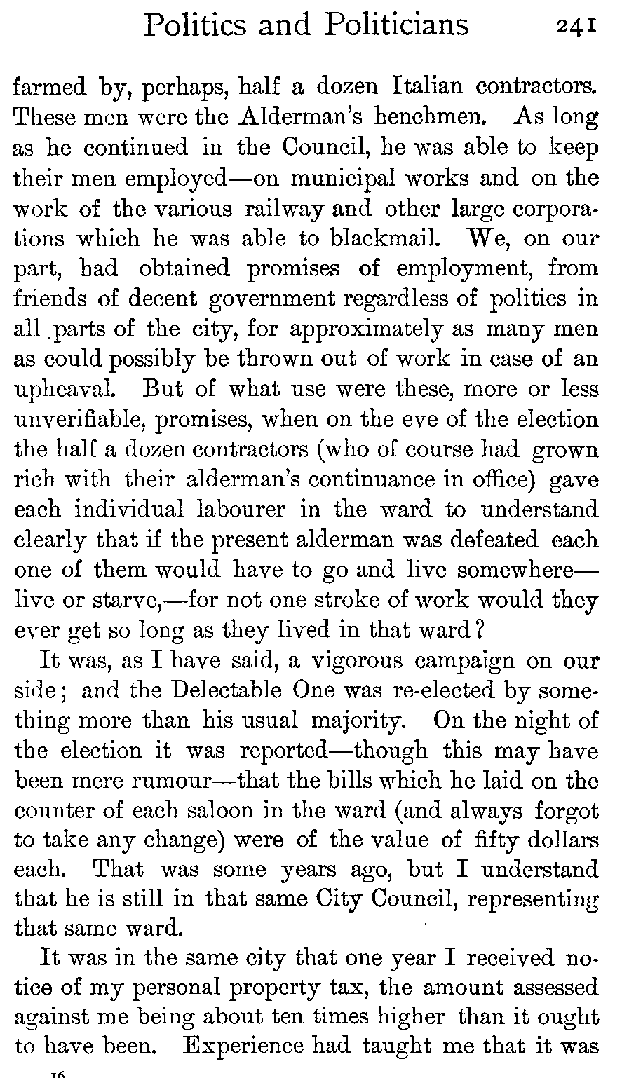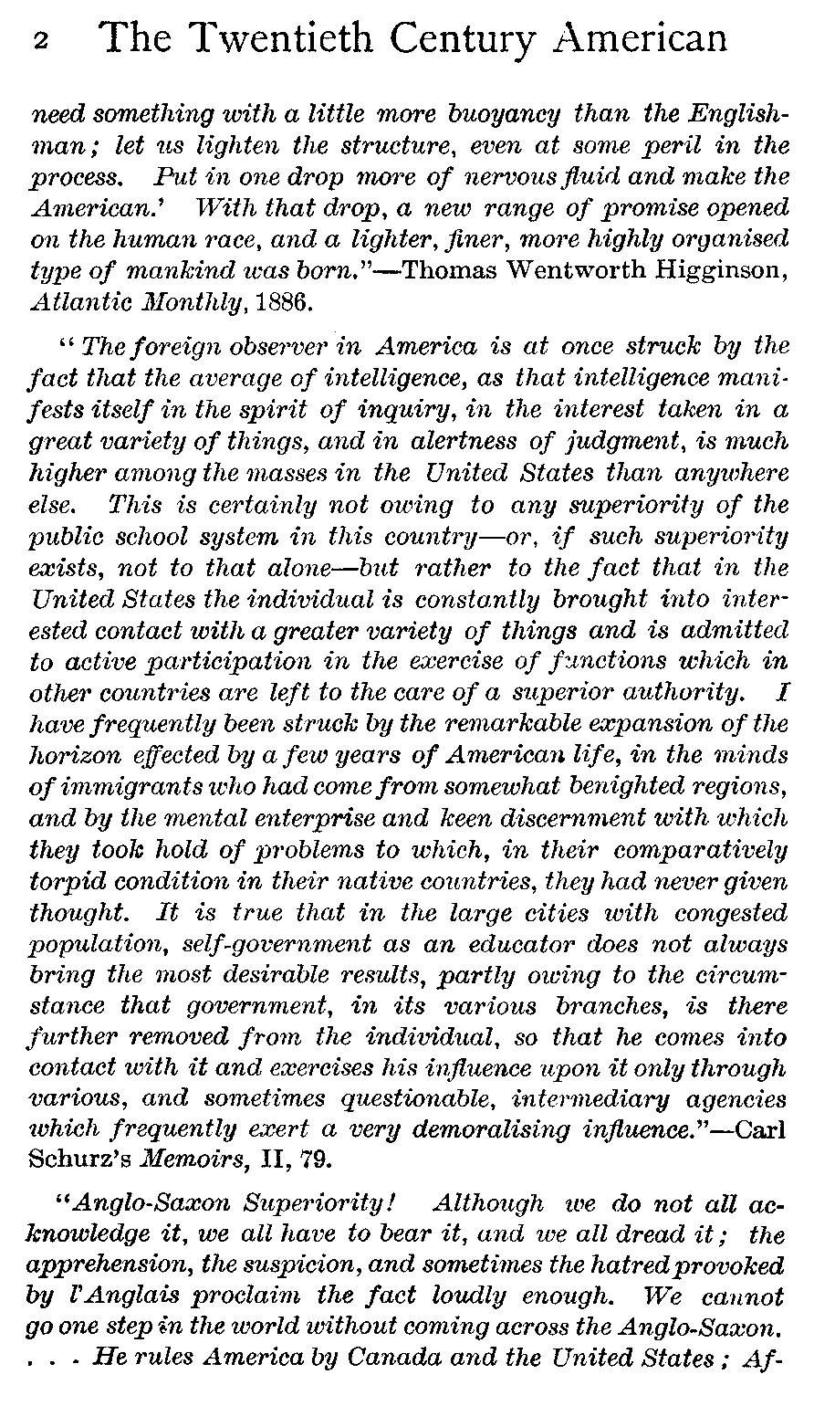 "The foreign observer in America is at once struck by the fact that the average of intelligence, as that intelligence manifests itself in the spirit of inquiry, in the interest taken in a great variety of things, and in alertness of judgment, is much higher among the masses in the United States than anywhere else. This is certainly not owing to any superiority of the public school system in this country—or, if such superiority exists, not to that alone—but rather to the fact that in the United States the individual is constantly brought into interested contact with a greater variety of things and is admitted to active participation in the exercise of functions which in other countries are left to the care of a superior authority. I have frequently been struck by the remarkable expansion of the horizon effected by a few years of American life, in the minds of immigrants who had come from somewhat benighted regions, and by the mental enterprise and keen discernment with which they took hold of problems to which, in their comparatively torpid condition in their native countries, they had never given thought. It is true that in the large cities with congested population, self-government as an educator does not always bring the most desirable results, partly owing to the circumstance that government, in its various branches, is there further removed from the individual, so that he comes into contact with it and exercises his influence upon it only through various, and sometimes questionable, intermediary agencies which frequently exert a very demoralising influence."—Carl Schurz's Memoirs, II, 79.