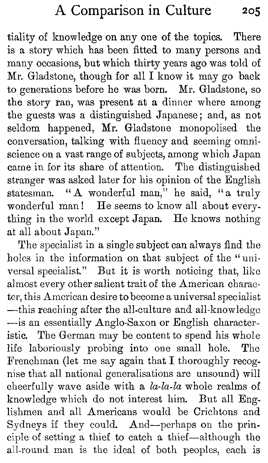 The Advantage of Youth—Japanese Eclecticism and American—The Craving for the Best—Cyrano de Bergerac—Verestschagin—Culture by Paroxysms—Mr. Gladstone and the Japanese—Anglo-Saxon Crichtons—Americans as Linguists—England's Past and America's Future—Americanisms in Speech—Why They are Disappearing in America—And Appearing in England—The Press and the Copyright Laws—A Look into the Future. |