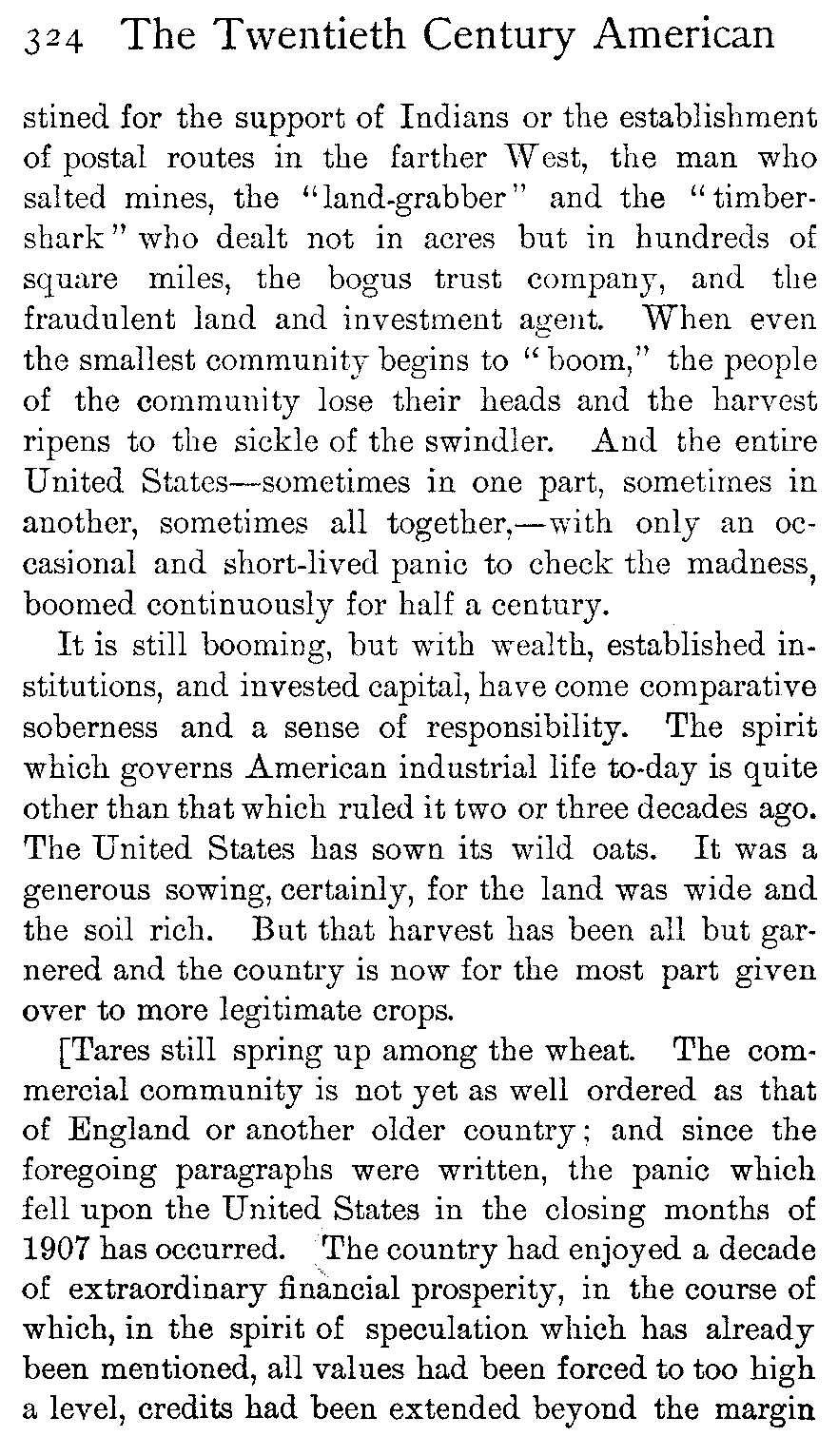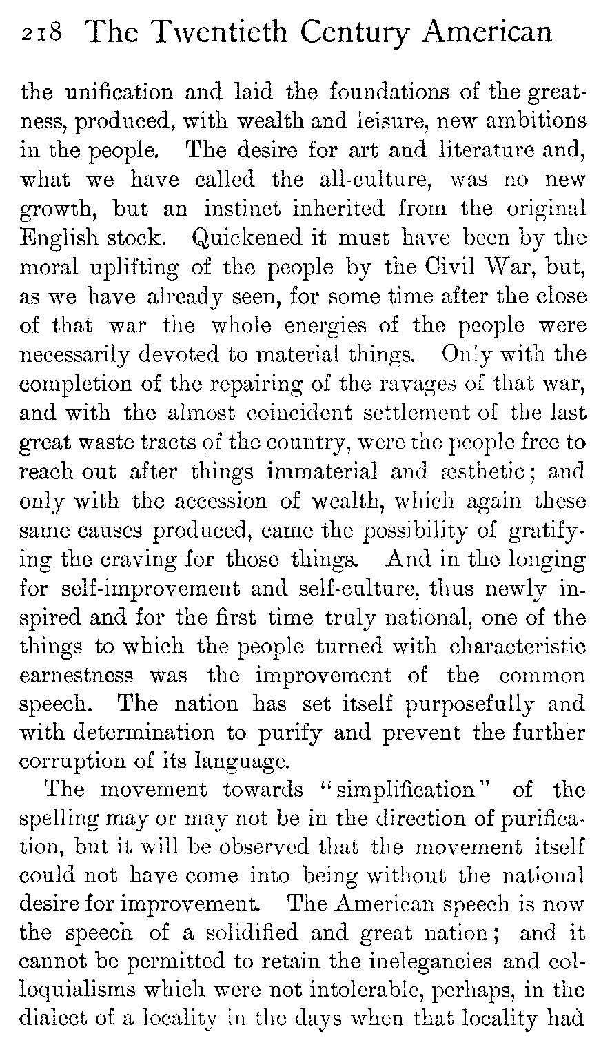 Since the establishment of the Republic, in the necessity of civilizing a continent, in the breathless struggle of the Civil War, in the rapidity with which society has been compelled to organize itself, in the absorption and assimilation of the continuous stream of foreign immigrants, the people have always been at grips with problems of immediate, almost desperate urgency; and they have never lost, or come near to losing, heart or courage. They have learned above all things the lesson of the efficacy of work. They have acquired the habit of action. Self-reliance has been bred in them. They know that in the haste of the days of ferment abuses grew up and went unchecked; and they know that in that same haste they missed some of the elegancies which a more leisurely and easier life might have given opportunity to acquire. But for a generation back, they have been earnestly striving to eradicate those abuses and to lift themselves, their speech, their manners, their art and literature to, at least, a level with the highest. It has been impossible in these pages (it would perhaps be impossible in any pages) to give any unified picture of this national character with its activity, its self-reliance, its belief in the homely virtues and its earnest ambition to make the best of itself. But of the future of a people with such a character there need be no misgivings, and Americans are justified in the confidence in their destiny.