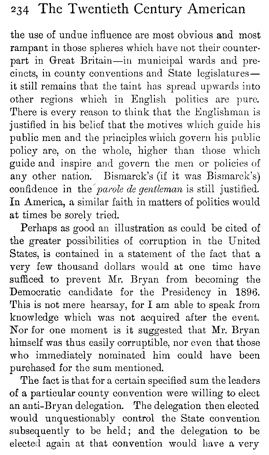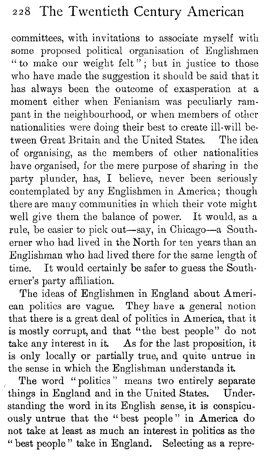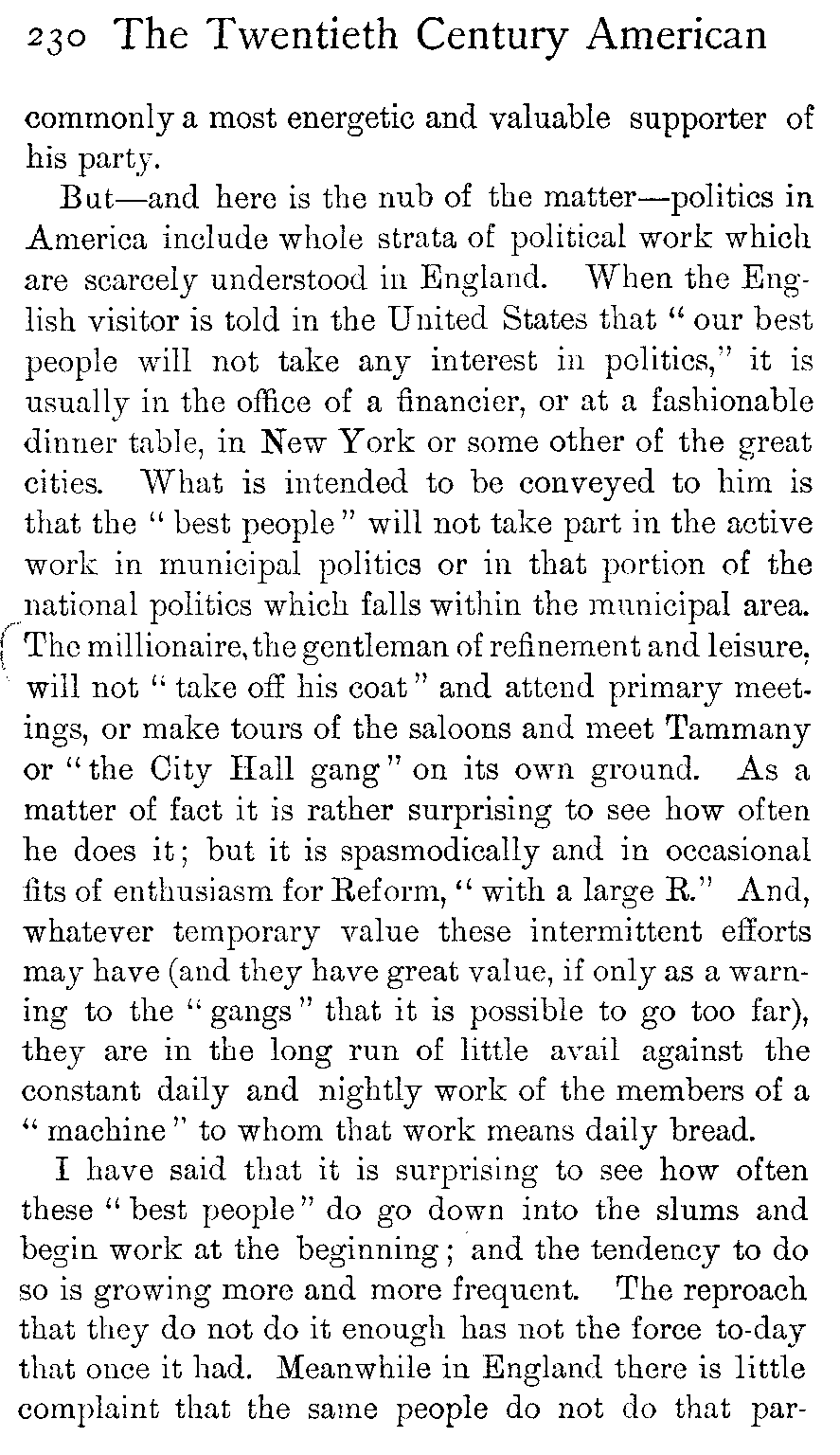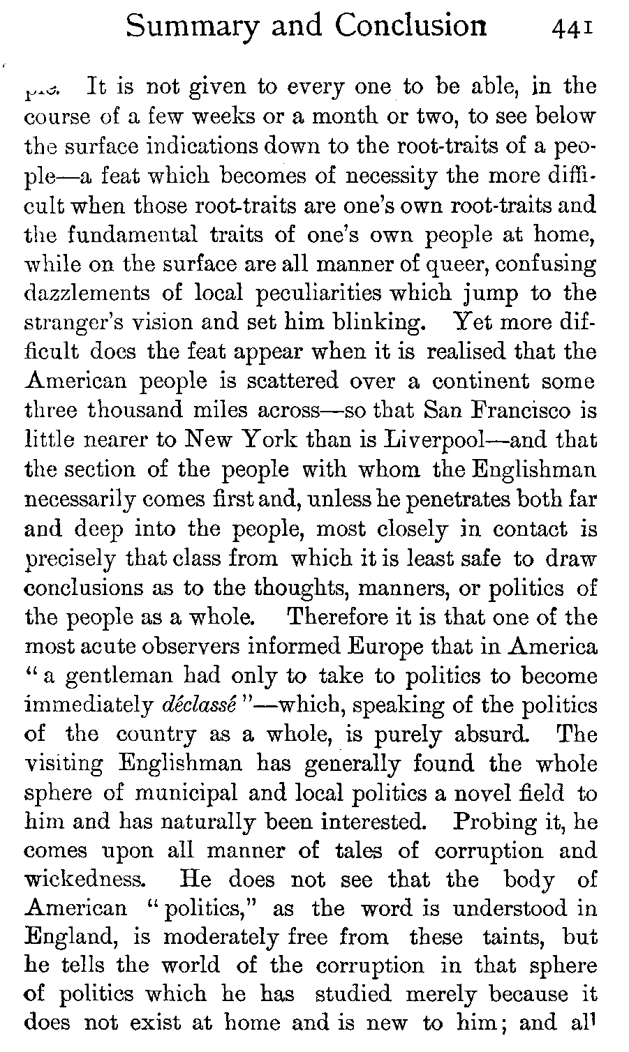 Moreover, many Englishmen go to the United States—the vast majority for a stay of a few days or weeks, or a month or two—and they tell their friends, or the public at large in print, all about America and its [441]people. It is not given to every one to be able, in the course of a few weeks or a month or two, to see below the surface indications down to the root-traits of a people—a feat which becomes of necessity the more difficult when those root-traits are one's own root-traits and the fundamental traits of one's own people at home, while on the surface are all manner of queer, confusing dazzlements of local peculiarities which jump to the stranger's vision and set him blinking. Yet more difficult does the feat appear when it is realised that the American people is scattered over a continent some three thousand miles across—so that San Francisco is little nearer to New York than is Liverpool—and that the section of the people with whom the Englishman necessarily comes first and, unless he penetrates both far and deep into the people, most closely in contact is precisely that class from which it is least safe to draw conclusions as to the thoughts, manners, or politics of the people as a whole. Therefore it is that one of the most acute observers informed Europe that in America "a gentleman had only to take to politics to become immediately déclassé"—which, speaking of the politics of the country as a whole, is purely absurd. The visiting Englishman has generally found the whole sphere of municipal and local politics a novel field to him and has naturally been interested. Probing it, he comes upon all manner of tales of corruption and wickedness. He does not see that the body of American "politics," as the word is understood in England, is moderately free from these taints, but he tells the world of the corruption in that sphere of politics which he has studied merely because it does not exist at home and is new to him; and all [442]the world knows that American politics are indescribably corrupt.