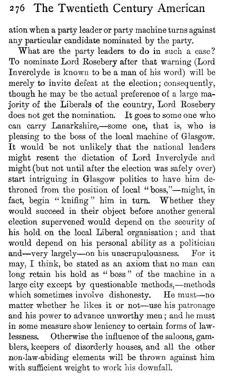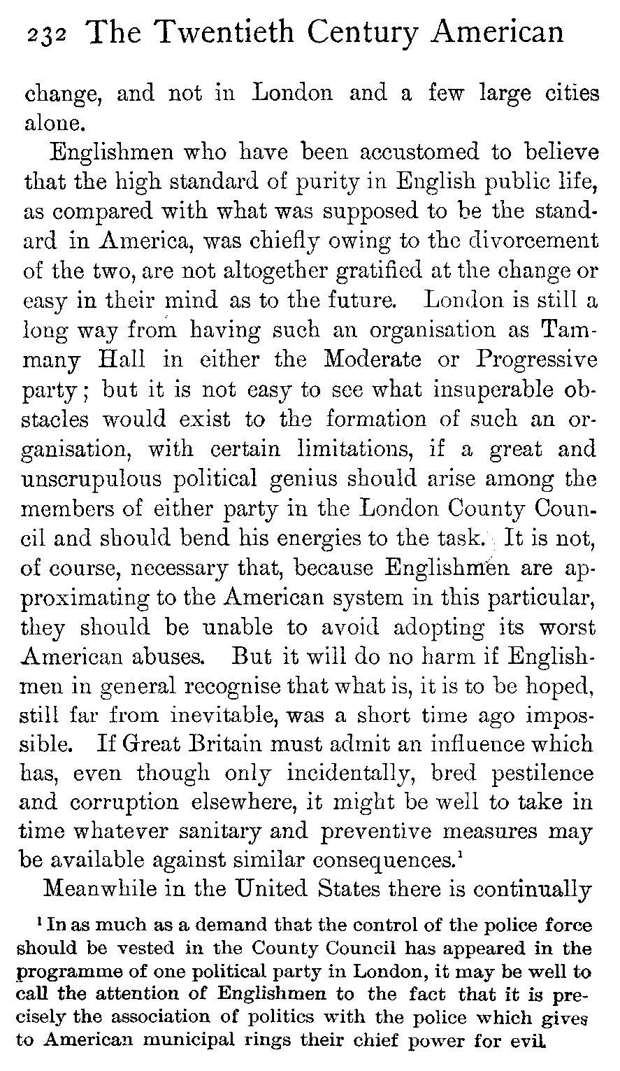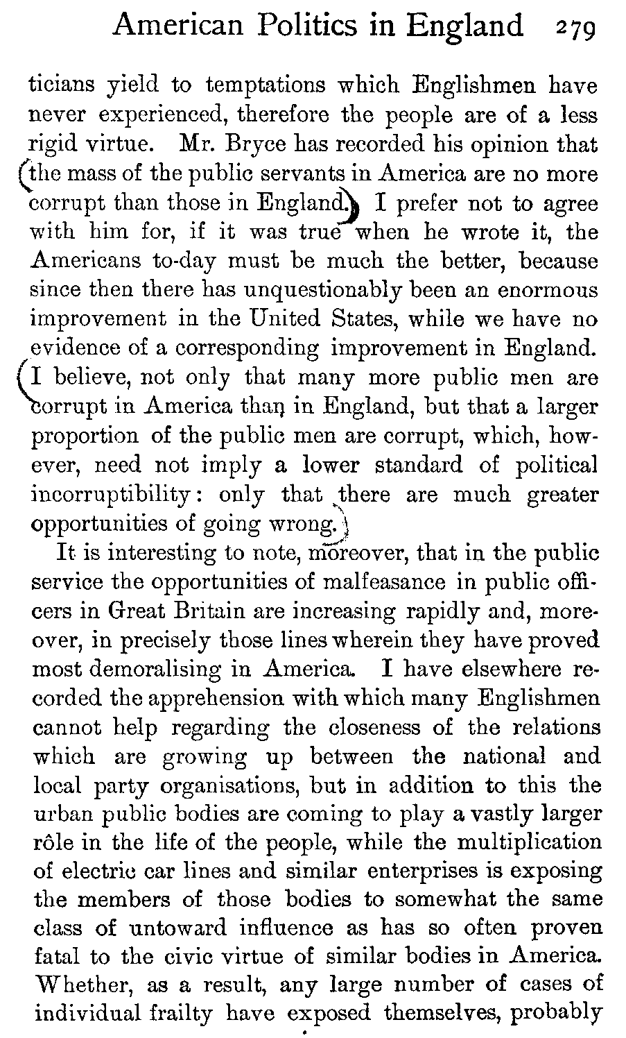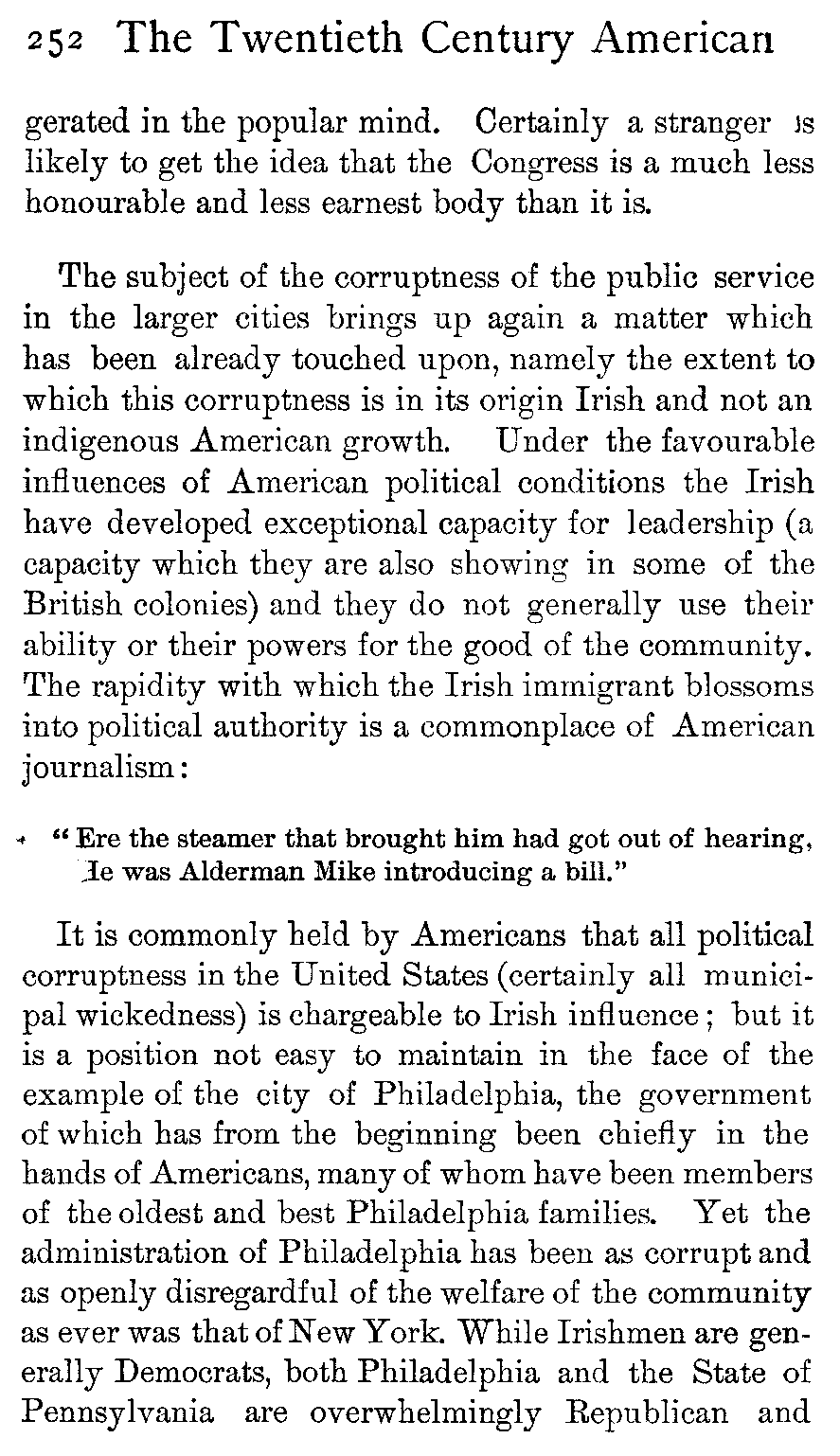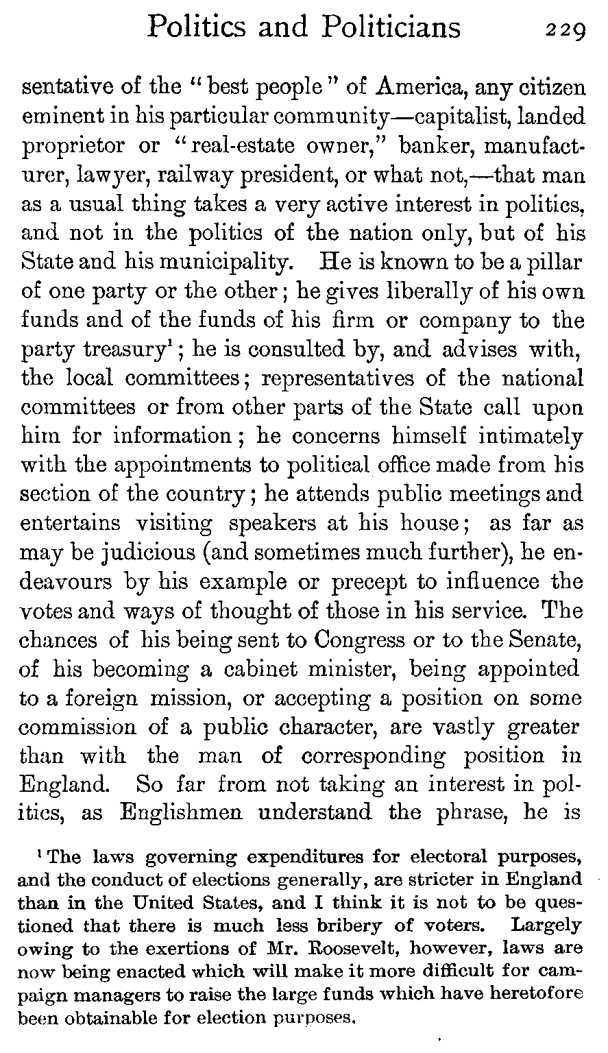 Moreover, many Englishmen go to the United States—the vast majority for a stay of a few days or weeks, or a month or two—and they tell their friends, or the public at large in print, all about America and its [441]people. It is not given to every one to be able, in the course of a few weeks or a month or two, to see below the surface indications down to the root-traits of a people—a feat which becomes of necessity the more difficult when those root-traits are one's own root-traits and the fundamental traits of one's own people at home, while on the surface are all manner of queer, confusing dazzlements of local peculiarities which jump to the stranger's vision and set him blinking. Yet more difficult does the feat appear when it is realised that the American people is scattered over a continent some three thousand miles across—so that San Francisco is little nearer to New York than is Liverpool—and that the section of the people with whom the Englishman necessarily comes first and, unless he penetrates both far and deep into the people, most closely in contact is precisely that class from which it is least safe to draw conclusions as to the thoughts, manners, or politics of the people as a whole. Therefore it is that one of the most acute observers informed Europe that in America "a gentleman had only to take to politics to become immediately déclassé"—which, speaking of the politics of the country as a whole, is purely absurd. The visiting Englishman has generally found the whole sphere of municipal and local politics a novel field to him and has naturally been interested. Probing it, he comes upon all manner of tales of corruption and wickedness. He does not see that the body of American "politics," as the word is understood in England, is moderately free from these taints, but he tells the world of the corruption in that sphere of politics which he has studied merely because it does not exist at home and is new to him; and all [442]the world knows that American politics are indescribably corrupt.