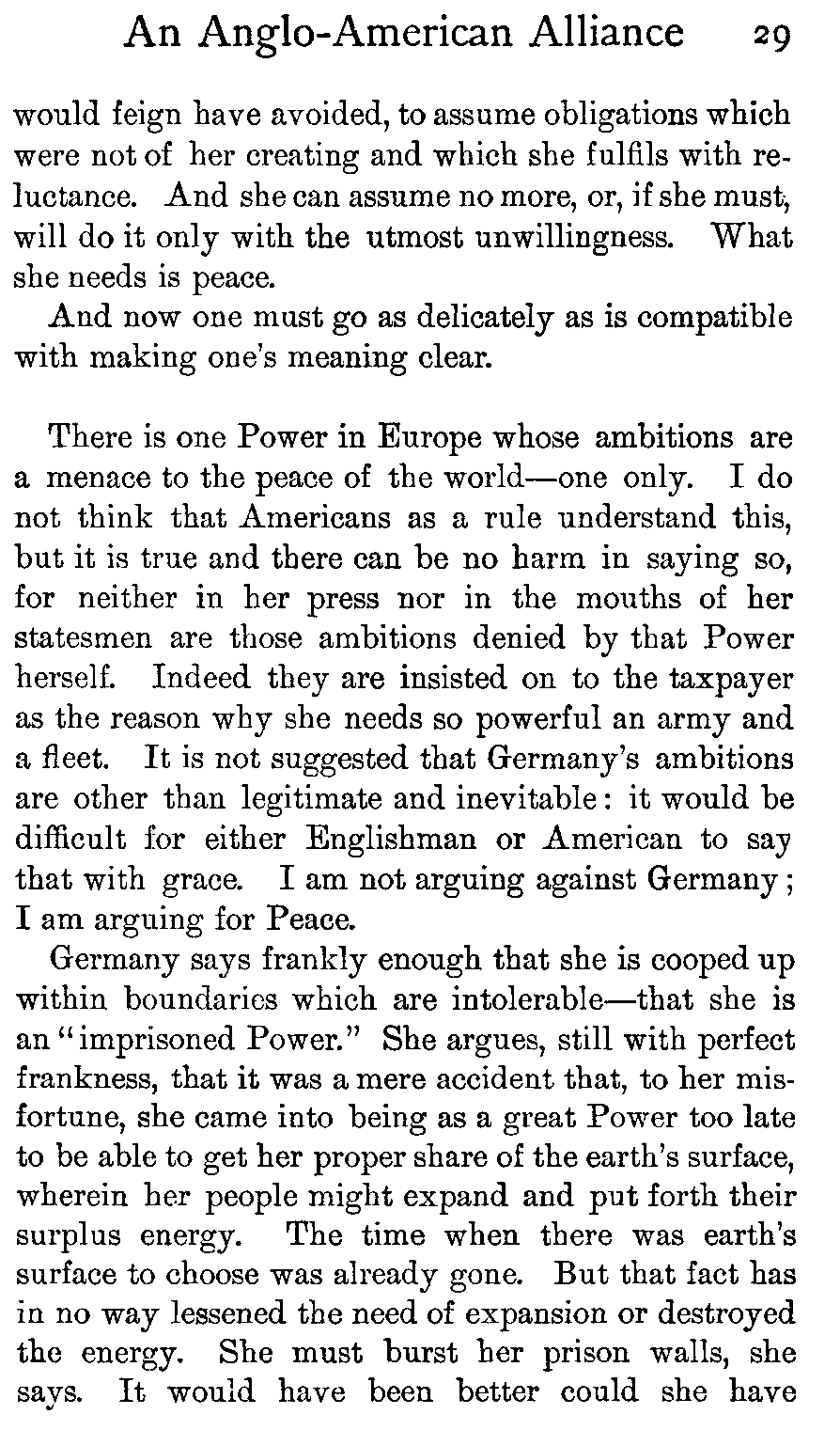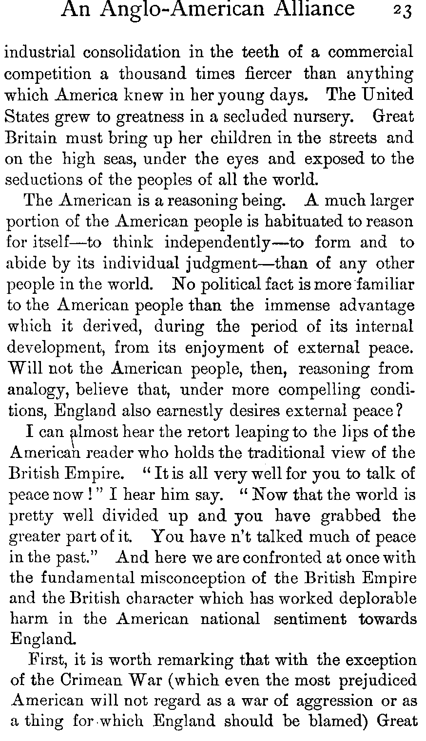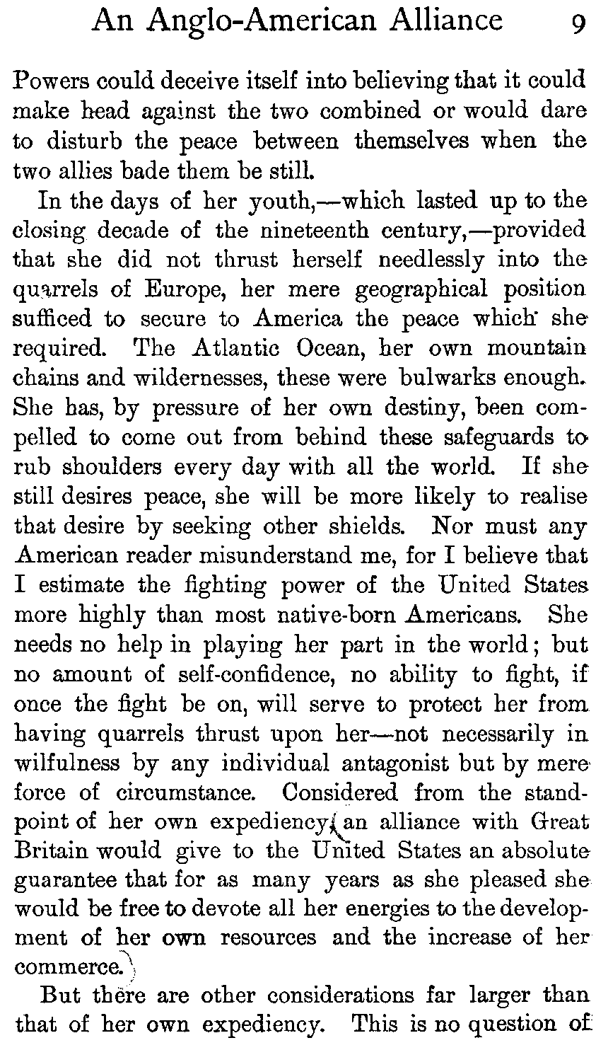 The Avoidance of Entangling Alliances—What the Injunction Meant—What it Cannot Mean To-day—The Interests of the United States, no less than those of England, Demand an Alliance—But Larger Interests than those of the Two Peoples are Involved—American Responsiveness to Ideals—The Greatest Ideal of All, Universal Peace: the Practicability of its Attainment—America's Responsibility—Misconceptions of the British Empire—Germany's Position—American Susceptibilities. |