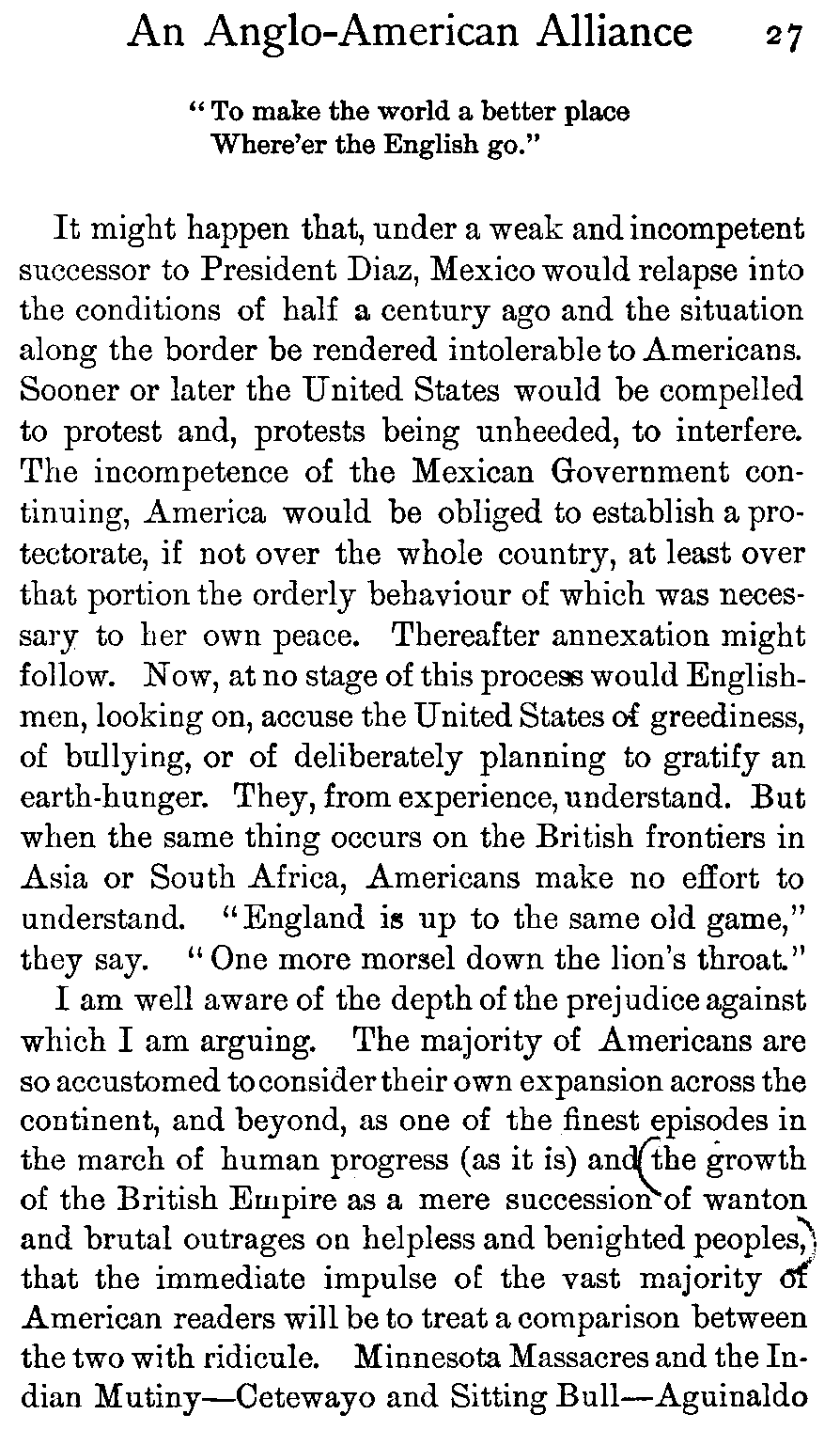A New Way of Making Friends—The Desirability of an Alliance—For the Sake of Both Peoples—And of All the World—The Family Resemblance—Mutual Misunderstandings—American Conception of the British Character—English Misapprehension of Americans—Foreign Influences in the United States—Why Politicians Hesitate—An Appeal to the People—And to Cæsar.