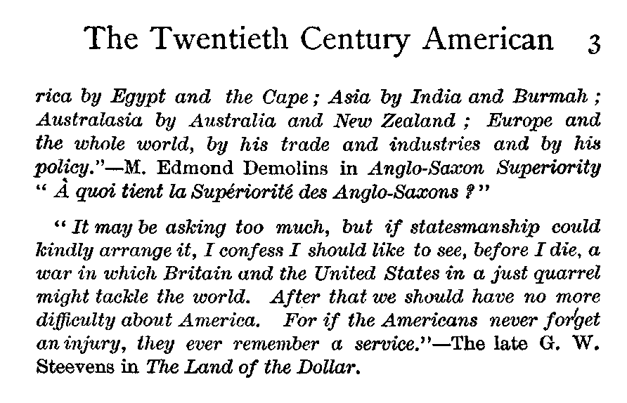 "It may be asking too much, but if statesmanship could kindly arrange it, I confess I should like to see, before I die, a war in which Britain and the United States in a just quarrel might tackle the world. After that we should have no more difficulty about America. For if the Americans never forget an injury, they ever remember a service."—The late G. W. Steevens in The Land of the Dollar.