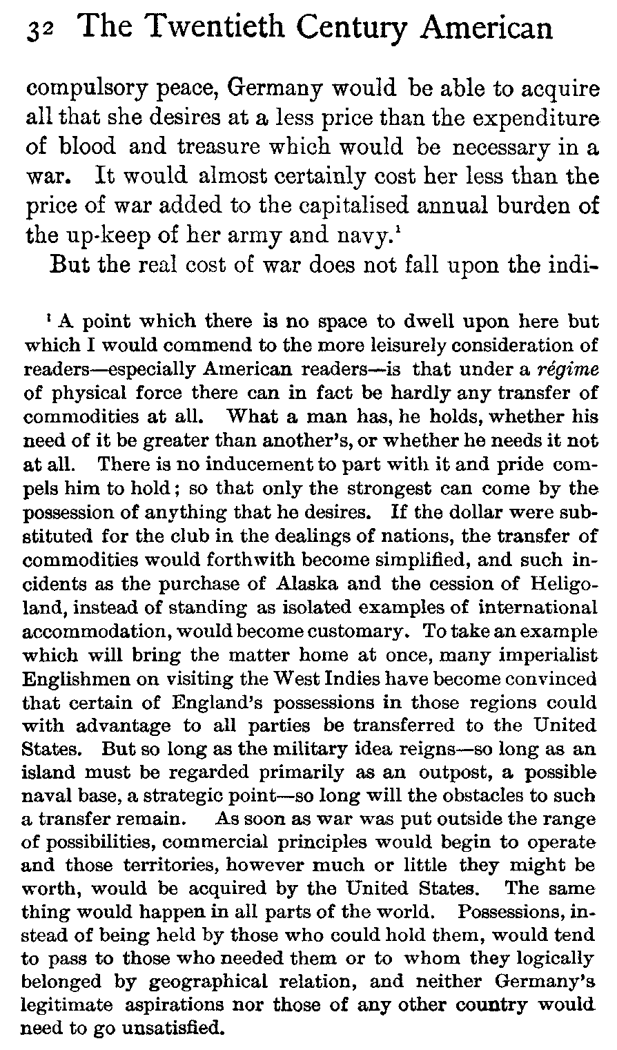 It is no novelty, either in the United States or in other countries, for considerations of temporary political expediency to stand in the way of the welfare of the people, nor is there any particular reason why an American politician should attach any importance to the desires of England. But we find ourselves again confronted with the same old question, whether the American people as a whole, who have often shown an ability to rise above party politics, can find any excuse for setting any consideration, either of individual or partisan interest, above the welfare of all the world. [447]Yet once more: It is for Americans individually to ask their consciences whether any considerations whatever, actual or conceivable, justify them in withholding from all humanity the boon which it is in their power, and theirs alone, to give,—the blessing of Universal and Perpetual Peace.