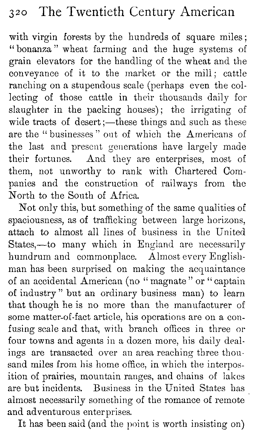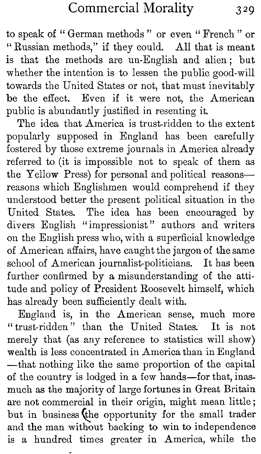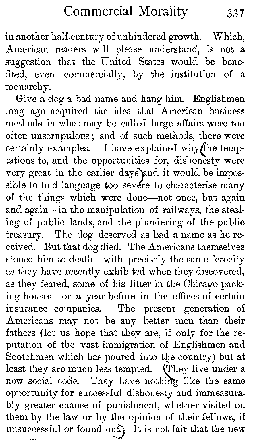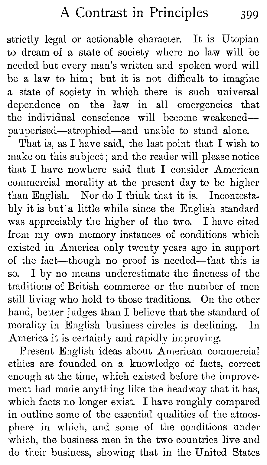 Whenever a financial fraud of a large size is discovered in America, the world is told of it, just as certainly as it is told when an English peer finds his way to the divorce court; but nobody expounds to the nations the excellence of the honourable lives which are led by most American millionaires, any more than the world is kept informed of the drab virtue of the majority of the British aristocracy. Wherefore the English people have come to think of American business ethics as being too often of the shadiest; whereas they ought on reflection to be aware that only in most exceptional cases can great or permanent individual commercial success be won by fraud, and that nothing but fundamental honesty will serve as the basis for a great national trade such as the United States has built up.