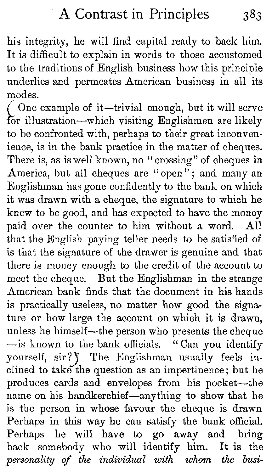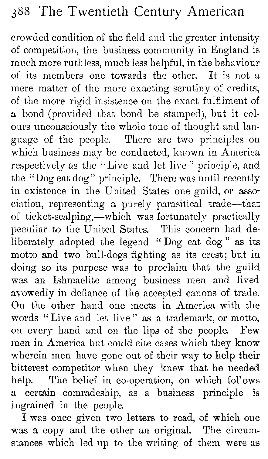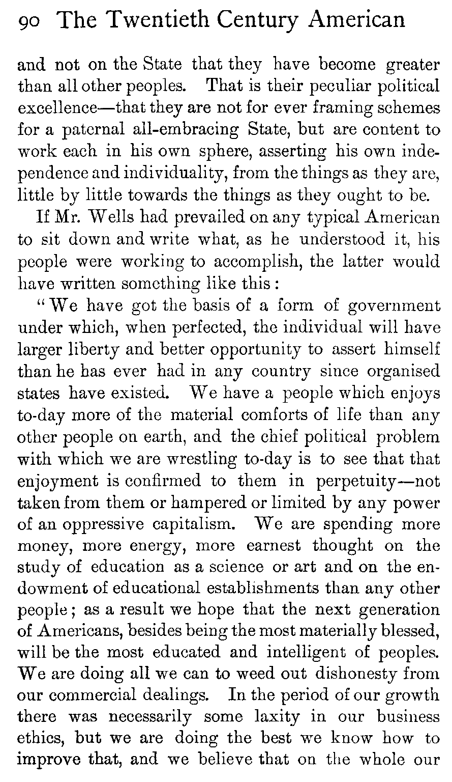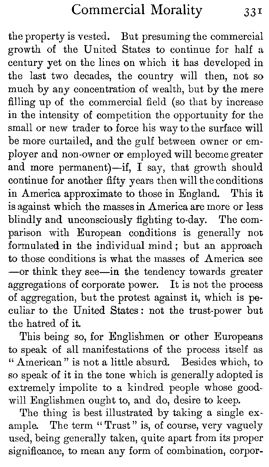 Whenever a financial fraud of a large size is discovered in America, the world is told of it, just as certainly as it is told when an English peer finds his way to the divorce court; but nobody expounds to the nations the excellence of the honourable lives which are led by most American millionaires, any more than the world is kept informed of the drab virtue of the majority of the British aristocracy. Wherefore the English people have come to think of American business ethics as being too often of the shadiest; whereas they ought on reflection to be aware that only in most exceptional cases can great or permanent individual commercial success be won by fraud, and that nothing but fundamental honesty will serve as the basis for a great national trade such as the United States has built up.