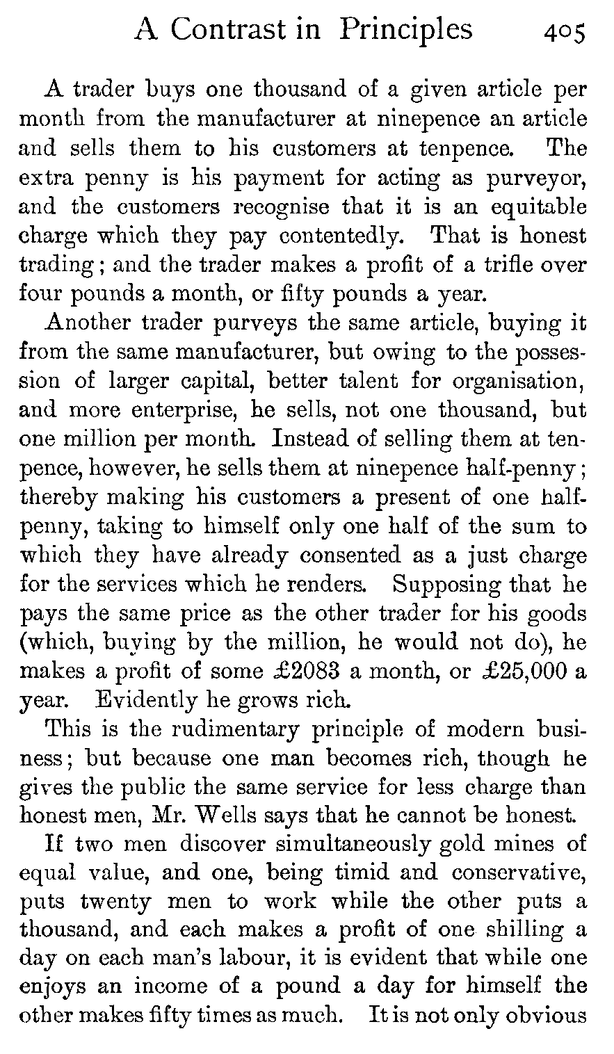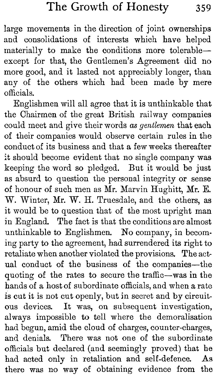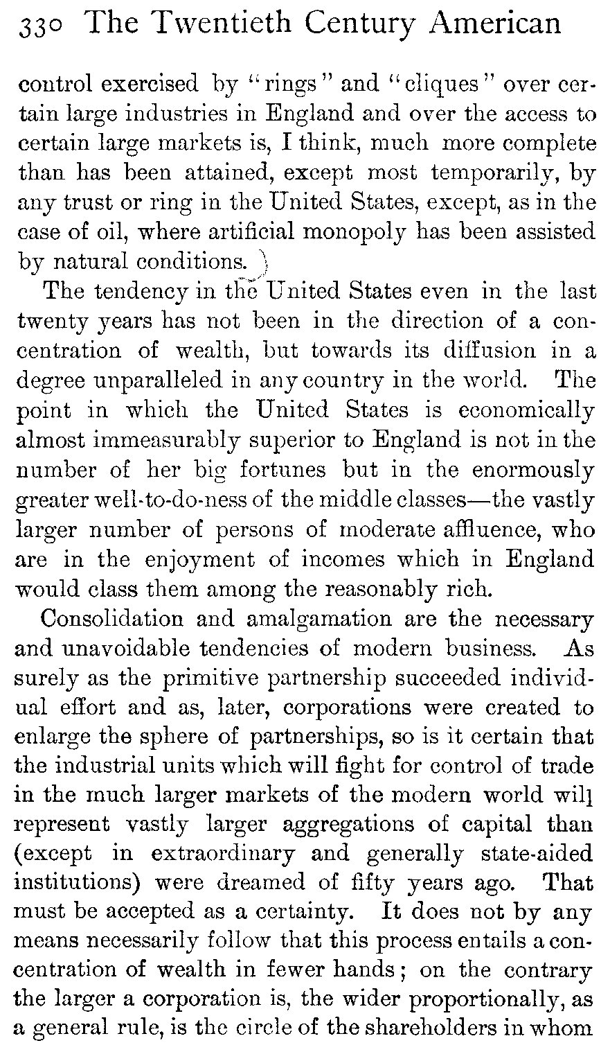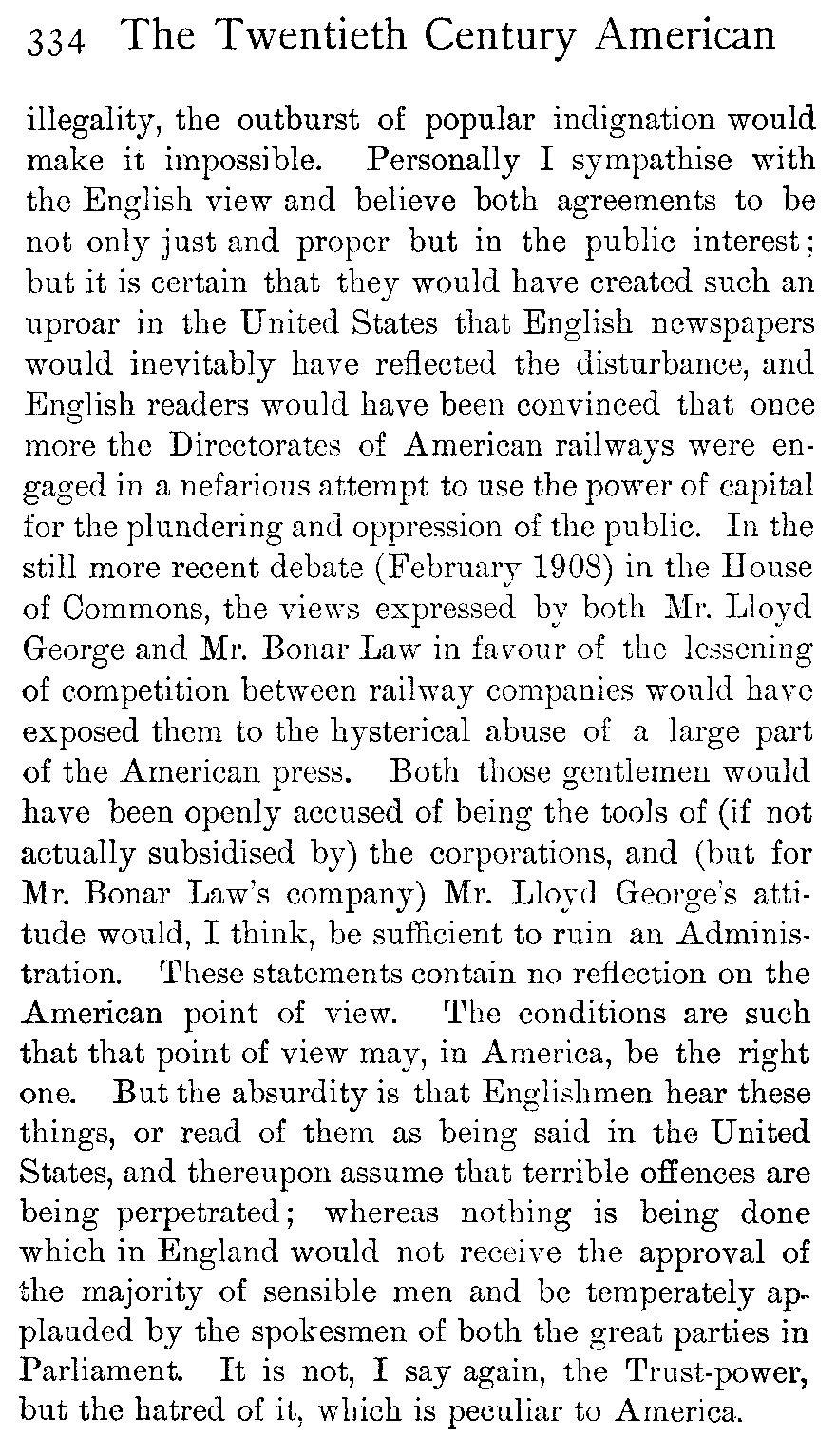 Whenever a financial fraud of a large size is discovered in America, the world is told of it, just as certainly as it is told when an English peer finds his way to the divorce court; but nobody expounds to the nations the excellence of the honourable lives which are led by most American millionaires, any more than the world is kept informed of the drab virtue of the majority of the British aristocracy. Wherefore the English people have come to think of American business ethics as being too often of the shadiest; whereas they ought on reflection to be aware that only in most exceptional cases can great or permanent individual commercial success be won by fraud, and that nothing but fundamental honesty will serve as the basis for a great national trade such as the United States has built up.