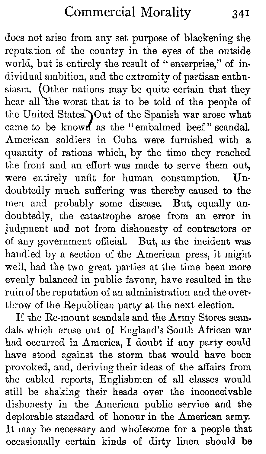 Are Americans more Honest than Englishmen?—An American Peerage—Senators and other Aristocrats—Trade and the British Upper Classes—Two Views of a Business Career—America's Wild Oats—The Packing House Scandals—"American Methods" in Business—A Countryman and Some Eggs—A New Dog—The Morals of British Peers—A Contract of Mutual Confidence—Embalmed Beef, Re-mounts, and War Stores—The Yellow Press and Mr. Hearst—American View of the House of Lords. |