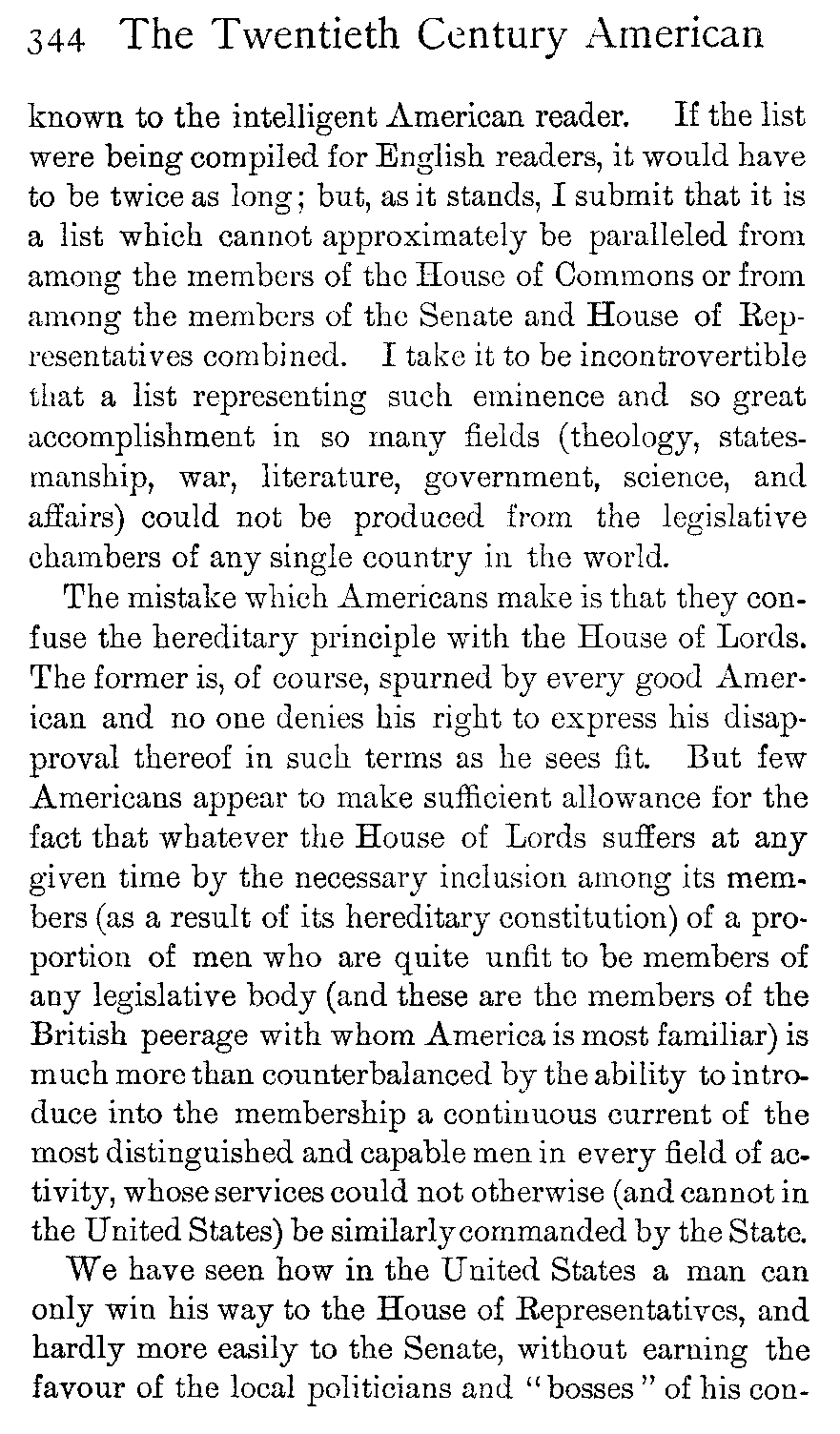 The same isolation and self-absorption as bred in them their sensitiveness to the opinions of others, made the Americans also unduly proud of such traits or accomplishments as strangers found to praise in them. This in itself might be good for a nation; but, so far as their understanding of Englishmen is concerned, it has unfortunately led them to suppose that those characteristics which they possess in so eminent a degree are proportionately lacking in the English character, which thereby incurs their contempt. Having been over-complimented on their own humour, they have determined that the Englishman is slow-witted, with no sense of fun—an opinion in itself so lacking in appreciation of its own absurdity as to be self-confounding. Too well assured of their own chivalrousness (a foible which they share with all peoples) they know the Englishman to be a domestic tyrant, incapable of true reverence of womanhood. Proud, not without reason, [437]of their own form of government, wherein there is no room for a titled aristocracy, they delight in holding the peerage of Great Britain up to contempt (withal that there is a curious unconfessed strain of jealousy mingling therewith), and piecing together, like a child playing with bricks, the not too infrequent appearances of individual peers in the divorce or bankruptcy courts, they have constructed a fantastic image of the British aristocracy as a whole, wherein every member appears as either a roué or a spendthrift. Because they are—and have been so much told that they are—so full of push and energy themselves, they believe Englishmen to be ponderous and without enterprise; whereas if, instead of keeping their eyes and minds permanently intent on their own achievements, they had looked more abroad, they would have seen that, magnificent as has been the work which they have done in the upbuilding of their own nation and wonderful as is the fabric of their greatness, there has simultaneously been evoked out of chaos a British Empire, vaster than their own estate, and which is only not so near completion as their own structure in proportion as it is on a larger ground plan, inspired by larger ideas and involving greater (as well as infinitely more diffused) labour in its uprearing.
