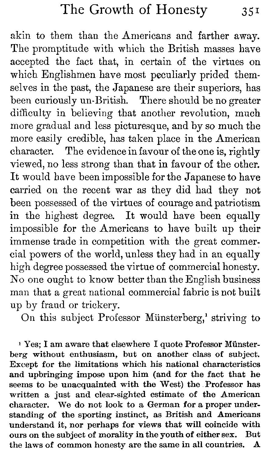 "The demand for 'fair play' dominates the whole American people, and shapes public opinion in all matters whether large or small. And with this finally goes the belief in the self-respect and integrity of one's neighbour. The American cannot understand how Europeans" (Continental Europeans, if you please, Mr. Münsterberg!) "so often reinforce their statements with explicit mention of their honour which is at stake, as if the hearer was likely to feel a doubt of it; and even American children are often apt to wonder at young people abroad who quarrel at play and at once suspect one another of some unfairness. The American system does not wait for years of discretion to come before exerting its influence; it makes itself felt in the nursery, where already the word of one child is never doubted by his playmates."
