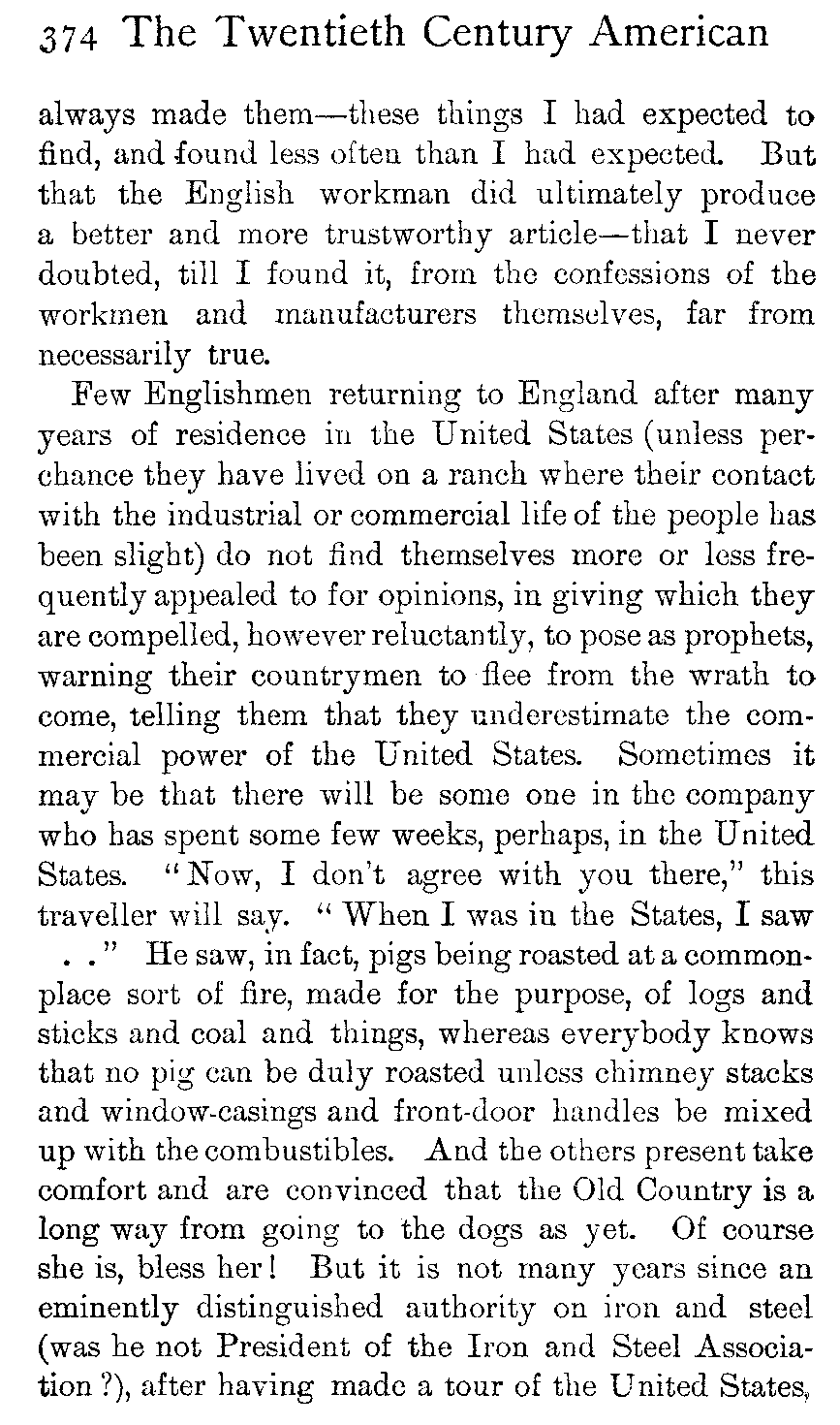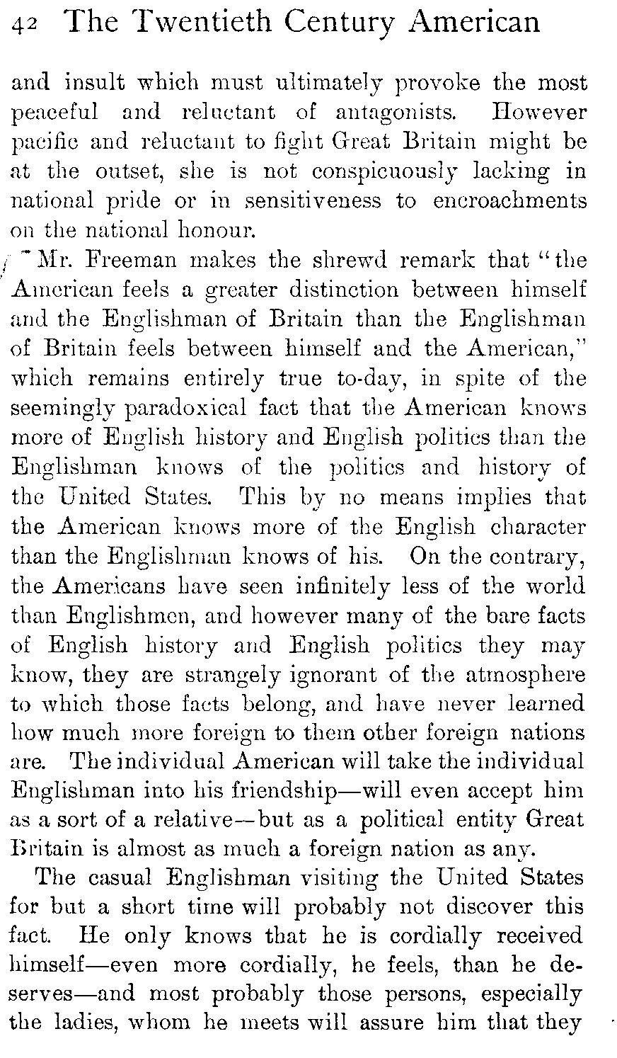 And I have said that, in holding these ideas, the Americans do but make a fair exchange of discourtesies; for the Englishman has likewise queer notions of the typical American. There is always this vast difference, however, that the Englishman is predisposed to like the American. In spite of his ignorance he feels a great—and, in view of that ignorance, an almost inexplicable—good-will for him. But it is not inexplicable, for once more the causes of his misapprehensions are easily traced.