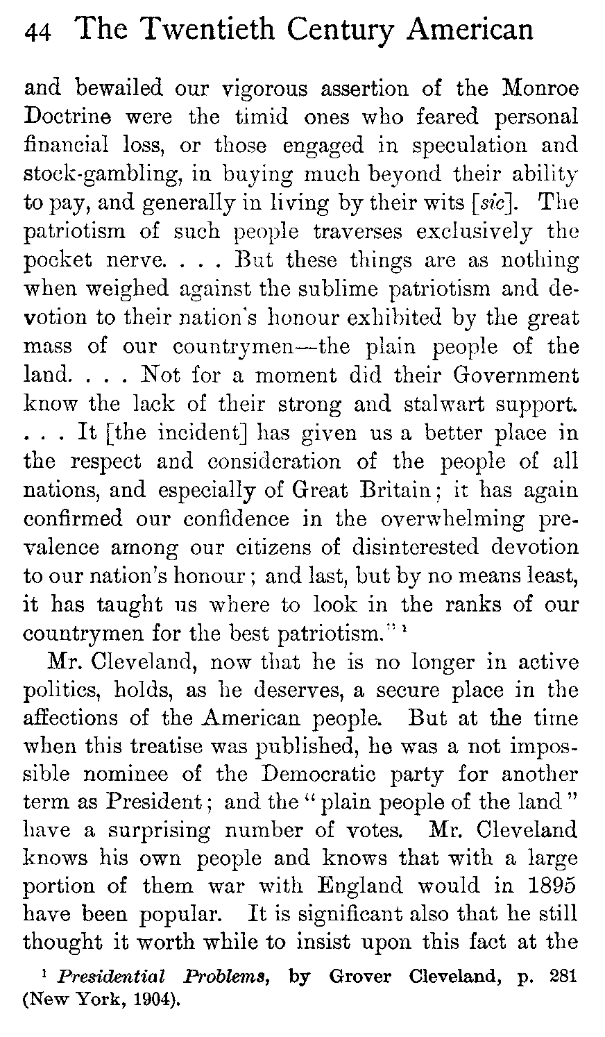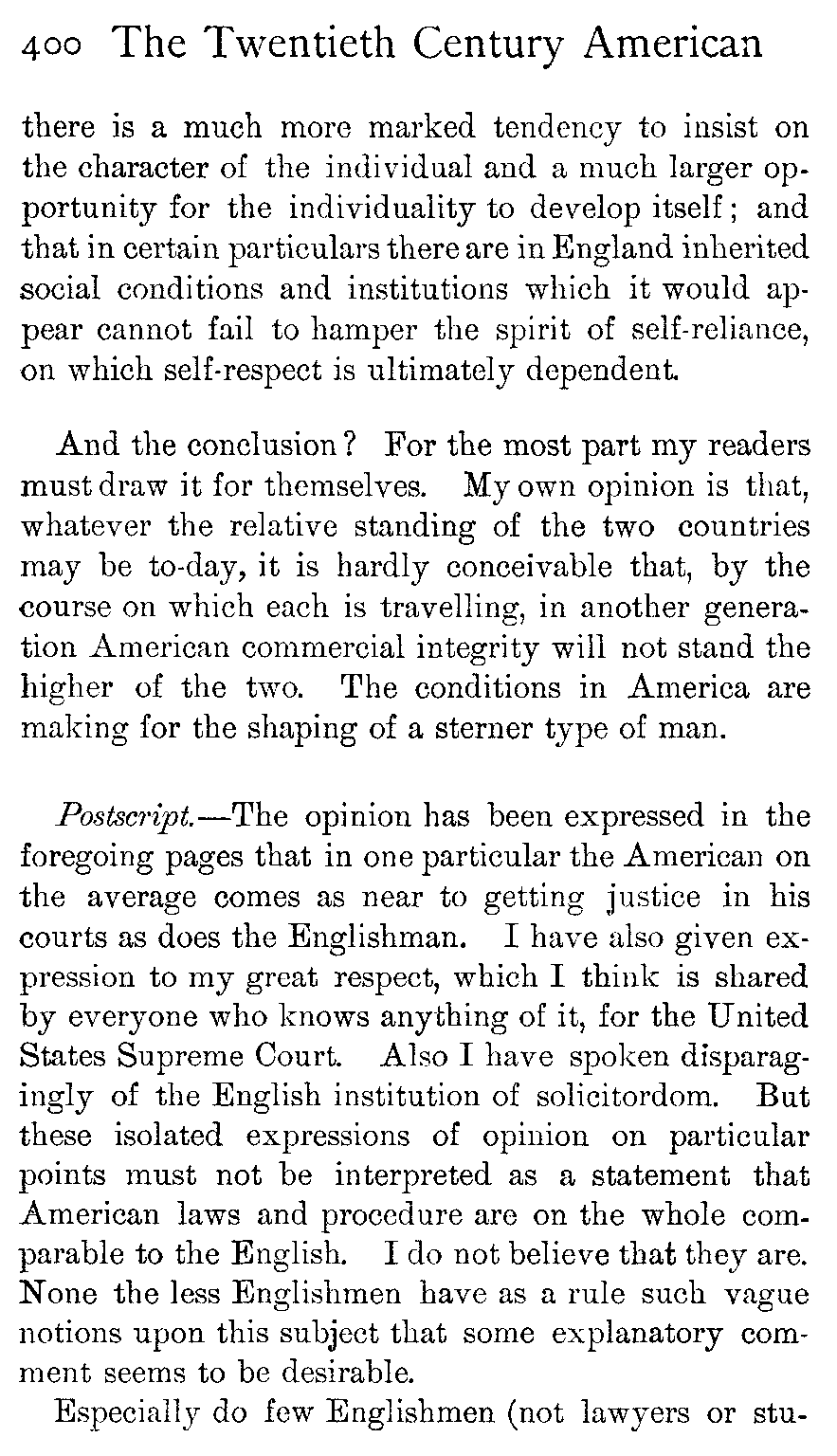 These misunderstandings do less harm to the Englishman than to the American, inasmuch as the Englishman has that predisposition to national cordiality which the American has not. But, though the Englishman's mistakes do not influence his good-will to the United States, though he himself attaches no serious importance to them, his utterance of them is taken seriously by the Americans themselves and does not tend to the promotion of international good feeling. Therefore it is that it is no less desirable that English misconceptions of the United States should [444]be corrected than it is that the American people should be brought to a juster appreciation of the British character and Empire.