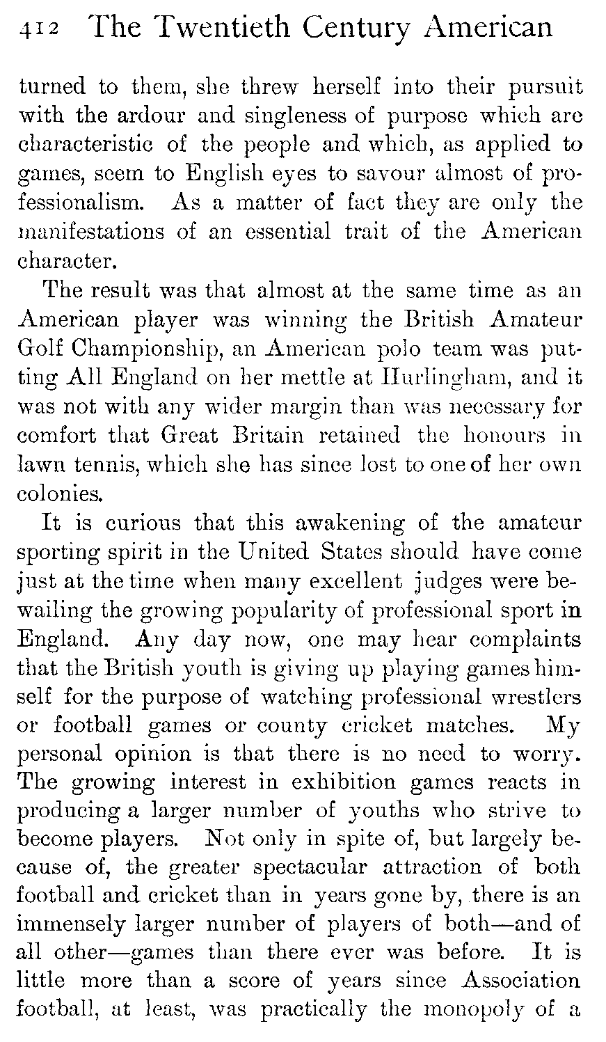 This is obviously in the realm of sport so much to America's advantage. It is not a condition against which the Englishman has any right to protest, any more than he has to move amendments to the Constitution of the United States. When better comprehended, Englishmen will accept it without either resentment or regret. The United States has a larger population than [424]Great Britain: so much the better for the United States. Also a larger proportion of that population must be admitted into the category of gentleman-amateur in sport; so much the more the better for them.