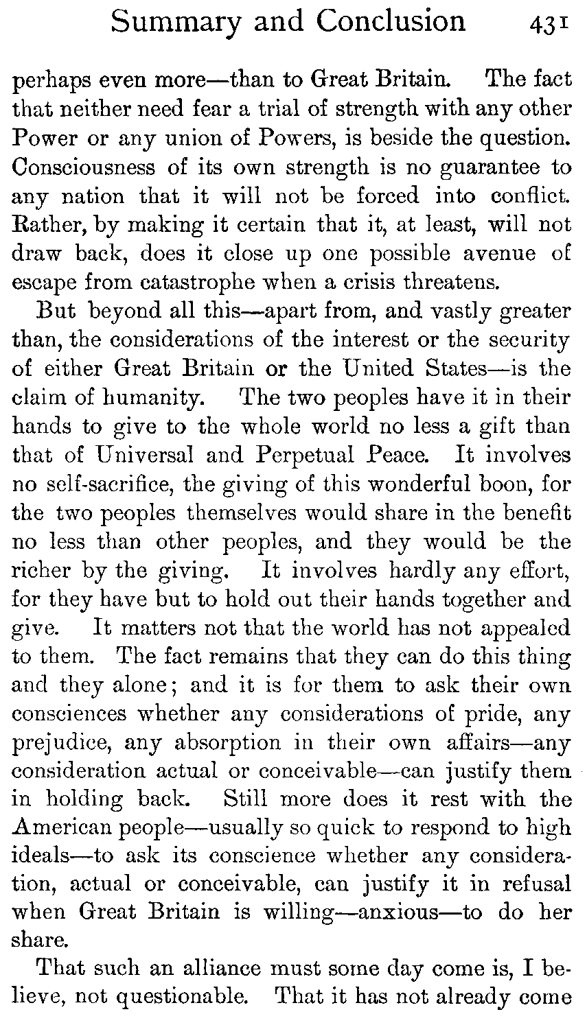 In summarising the contents of the foregoing pages, there is no need here to rehearse, except in barest outline, the arguments in favour of alliance between the countries. The fact that war between them is an ever-present possibility ought in itself to suffice—war which could hardly fail to be more sanguinary and destructive than any war that the world has known. The danger of such a war is greater, perhaps, than the people of either country recognises, certainly greater than most Englishmen imagine. The people of England do not understand the warlike—though so peace-loving—character of the American nation. It is just as warlike as, though no less peace-loving than, the English, without the restraint of that good-will which the English feel for the United States; without, moreover, the check, to which every European country is always subjected, of the fear of complications with other Powers. The American people, as a whole, it cannot be too earnestly impressed on Englishmen, have no such good-will towards Great Britain as Englishmen feel for them; and not even English reluctance to draw the sword, nor the protests of the better informed and the more well-to-do people in the United States would be able to restrain what Mr. Cleveland calls "the plain people of the land" if they once made up their mind to fight.