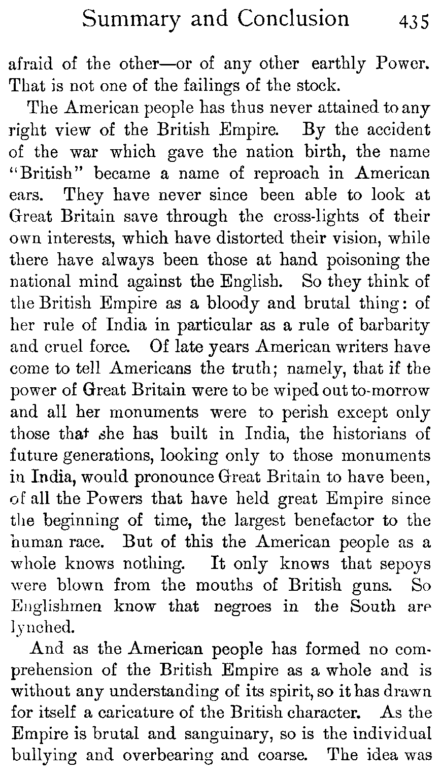 The American people has thus never attained to any right view of the British Empire. By the accident of the war which gave the nation birth, the name "British" became a name of reproach in American ears. They have never since been able to look at Great Britain save through the cross-lights of their own interests, which have distorted their vision, while there have always been those at hand poisoning the national mind against the English. So they think of the British Empire as a bloody and brutal thing: of her rule of India in particular as a rule of barbarity and cruel force. Of late years American writers have come to tell Americans the truth; namely, that if the power of Great Britain were to be wiped out to-morrow and all her monuments were to perish except only those that she has built in India, the historians of future generations, looking only to those monuments in India, would pronounce Great Britain to have been, of all the Powers that have held great Empire since the beginning of time, the largest benefactor to the human race. But of this the American people as a whole knows nothing. It only knows that sepoys were blown from the mouths of British guns. So Englishmen, know that negroes in the South are lynched.