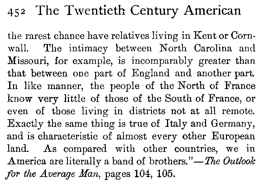 "England is not large in area and the people are generally regarded as homogeneous in their insularity. But as a matter of fact the populations of the different parts of England are scarcely at all acquainted in any other part. Thus the Yorkshireman would only by [452]the rarest chance have relatives living in Kent or Cornwall. The intimacy between North Carolina and Missouri, for example, is incomparably greater than that between one part of England and another part. In like manner, the people of the North of France know very little of those of the South of France, or even of those living in districts not at all remote. Exactly the same thing is true of Italy and Germany, and is characteristic of almost every other European land. As compared with other countries, we in America are literally a band of brothers."—The Outlook for the Average Man, pages 104, 105.