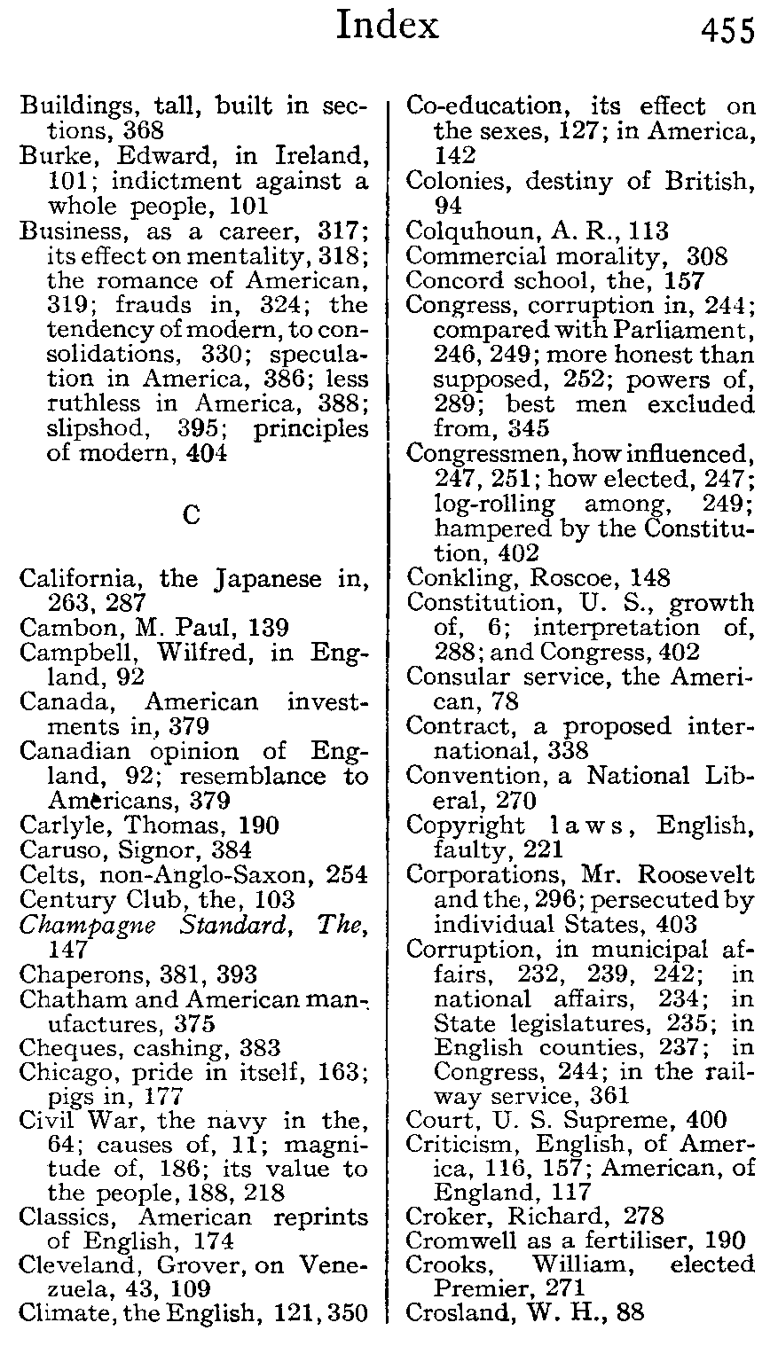 The "English-American" Vote—The Best People in Politics—What Politics Means in America—Where Corruption Creeps in—The Danger in England—A Presidential Nomination for Sale—Buying Legislation—Could it Occur in England?—A Delectable Alderman—Taxation while you Wait—Perils that England Escapes—The Morality of Congress—Political Corruption of the Irish—Democrat and Republican. |