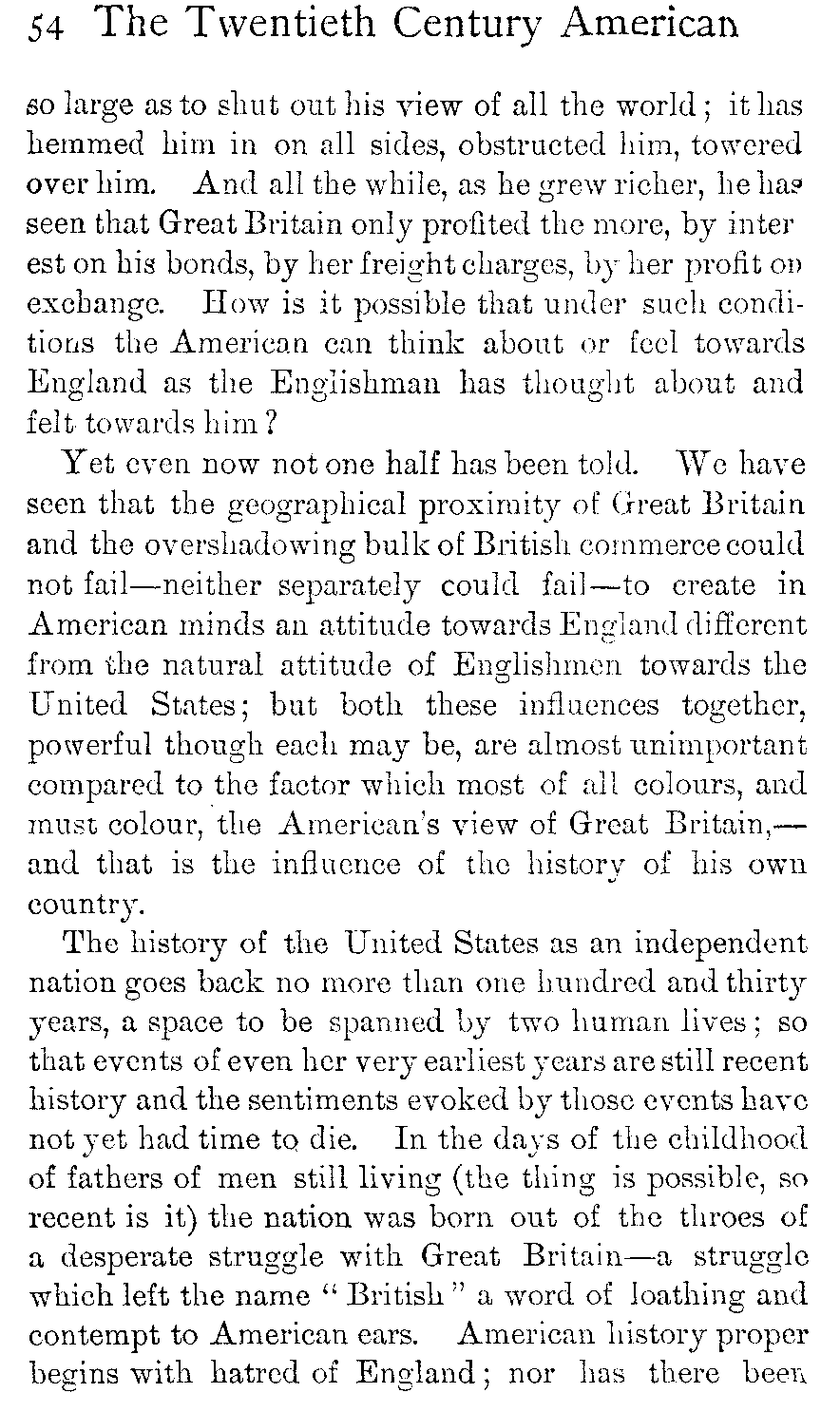 Not only does neither people understand with any clearness how like it is to the other, but each is under many misapprehensions—some trivial, some vital—in regard to the other's temperament and ways of life. These misapprehensions are the result chiefly of the geographical remoteness of the lands, so that intimate contact between anything like an appreciable portion of the two peoples has been impossible; and, when thus separated by so wide a sea, Great Britain [433]has been too consumedly engrossed in the affairs of the world to be able to give much time or thought to the United States, while America has been too isolated from that world, too absorbed in her own affairs, to be able to look at England in anything like true perspective.