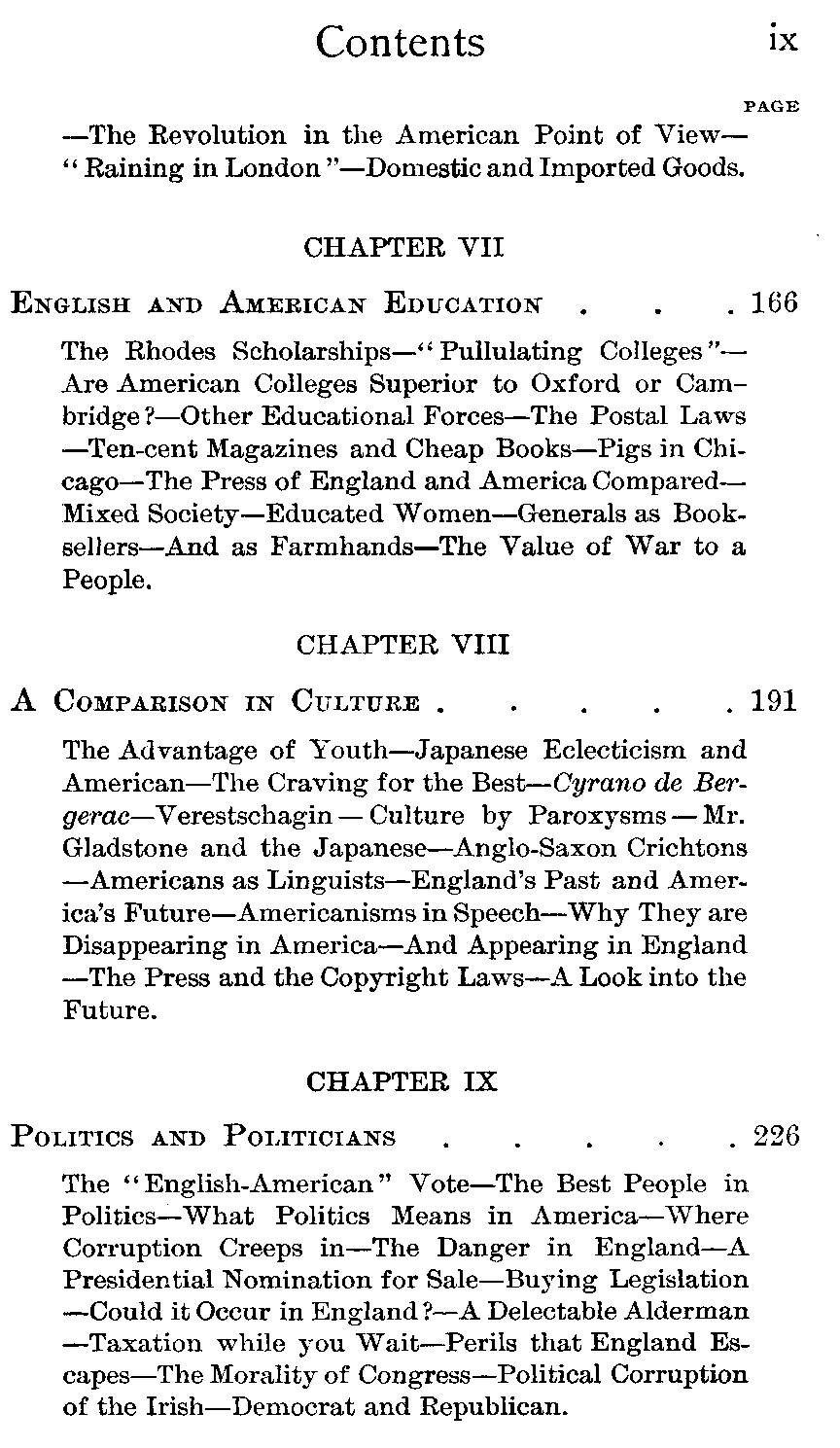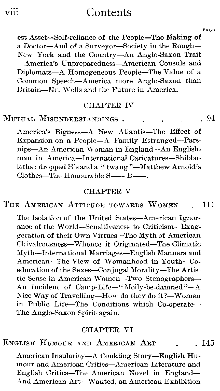 America's Bigness—A New Atlantis—The Effect of Expansion on a People—A Family Estranged—Parsnips—An American Woman in England—An Englishman in America—International Caricatures—Shibboleths: dropped H's and a "twang"—Matthew Arnold's Clothes—The Honourable S—— B——. |