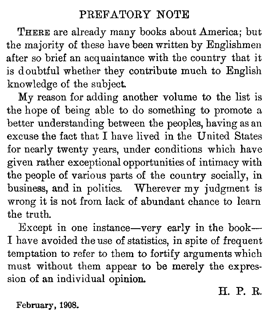 My reason for adding another volume to the list is the hope of being able to do something to promote a better understanding between the peoples, having as an excuse the fact that I have lived in the United States for nearly twenty years, under conditions which have given rather exceptional opportunities of intimacy with the people of various parts of the country socially, in business, and in politics. Wherever my judgment is wrong it is not from lack of abundant chance to learn the truth.