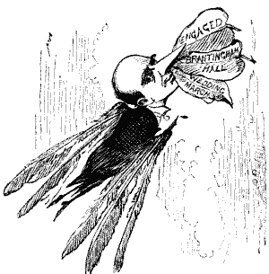 Tuesday.—Courtney on in his famous quick-change scene. One minute he is discovered in recesses of canopied chair as Speaker; the next is seated at table as Chairman of Committees. Speaker, everyone sorry to learn, is ill in bed. So Courtney doubles his part. Proceeding watched with profound interest from Strangers' Gallery. At ten minutes and ten seconds to Seven House in Committee of Supply. Courtney in Chair at table; Mace off the table; Tanner on his legs. As hand of clock falters over the numeral ten, Courtney gets up, says never a word, wheels to right out of Chair and marches to rear. Tanner stops midway in sentence and resumes seat. Sergeant-at-Arms bowing thrice advances, lifts Mace on to table, and retires. Stranger in Gallery wondering what has become of Courtney, appalled by discovering him in Speaker's Chair, quite a new man. On these occasions marks his swiftly varying condition by altered tone of voice. As Chairman of Committees, assumes piping treble voice, as Deputy-Chairman drops occasional observations in profound bass.