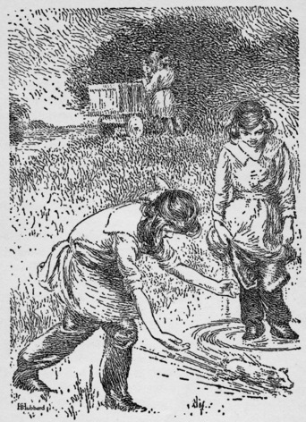 Huz and Buz, after lazily watching the children walk off, had apparently decided to join them, and were bringing up the rear a few yards behind. They were fat, rollicking pups, too young and clumsy to be very firm on their legs as yet. Jane turned round and ordered the rascals home. Marian called them back also, and after deliberating a moment uncertainly, they obeyed. They were encouraged to make a choice by a small stick Chicken Little hurled at them.