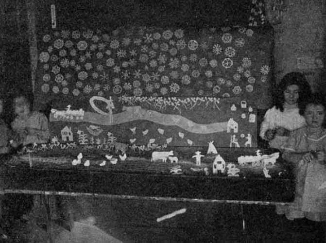 Christmas suggests the making of toys and all sorts of things suitable for gifts. If the work centers around the Christmas tree, it offers opportunity for coöperation in making trimming such as paper chains, pop-corn strings, etc., as well as individual gifts. If a tree is not obtainable, a box may be dressed up in imitation of Santa's sleigh drawn by cardboard reindeer. Whatever else is done in honor of the visit of St. Nicholas, the spirit of giving should be cultivated by making gifts to some younger or less fortunate groups. Picture books may be made for sick children, doll furniture and other toys for the orphans' home or some family of unfortunates. A sack might arrive a week or two before Christmas[Pg 113] accompanied by a telegram from Santa requesting contributions to help him out in some specific way and stating that it would be called for at a certain time. When a "real Santa" calls for the sack, he may leave in its place another containing some unexpected treat for the children themselves. The gifts which the children contribute should be of their own making, that they may have a full sense of real giving and not merely the pleasure of delivering the parcels mother has provided.