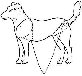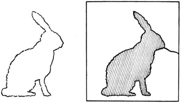 To make the animal stand the feet may be tacked to a small piece of wood about one inch square on the end and as long as needed, or a cardboard brace, such as is used on easels, may be glued to the back. A realistic effect is given if the animal is cut with two legs and the brace made to represent the other two, or a piece of cardboard cut as in Fig. 58 may be used as a brace, the body of the animal fitting into the notch.