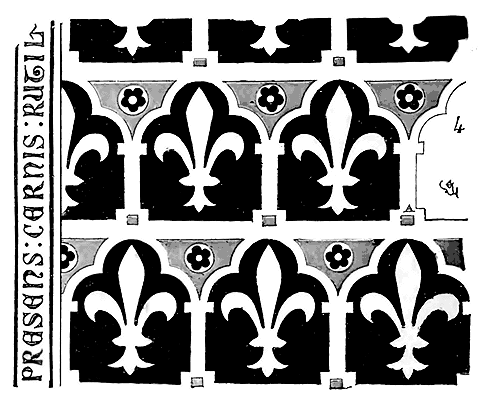 Ce dallage, dont nous donnons ci-contre un fragment au quart de l'exécution, est de même en liais. Le fond des fleurs de lis est noir, le fond des rosaces vert olive, les rosettes rouges ainsi que l'inscription; de petits cubes de verre dorés incrustés en A égayent l'ensemble de la coloration un peu sombre 6.