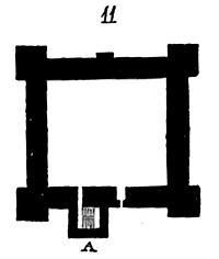 Voici donc, d'après la description de Sauval et les documents graphiques 574, le plan (1) en A des fourches patibulaires de Montfaucon. Vu leur hauteur (10m,00 au moins), les piliers ne pouvaient pas avoir moins d'un mètre de diamètre; les seize piliers, rangés «en deux files sur la largeur et une sur la longueur,» devaient laisser quinze intervalles entre eux de 1m,50 sur le grand côté et de 1m,20 sur les deux petits. Il ne pouvait donc y avoir qu'une chaîne à chaque traverse des petits côtés et deux au plus entre celles du grand. Les traverses étant au nombre de trois, cela faisait soixante chaînes. Ainsi s'explique le nombre de cinquante-deux chaînes neuves fournies en 1466; peut-être en restait-il quelques-unes anciennes pouvant servir. Les traverses étaient nécessairement doublées, tant pour fixer les chaînes que pour permettre au bourreau de se tenir dessus, et pour étrésillonner convenablement des piles aussi hautes. Il fallait donc quatre-vingt-dix traverses ou soixante seulement, si les traverses basses étaient simples. La fourniture de quarante-huit traverses neuves faite en 1425 n'a donc rien qui puisse surprendre.