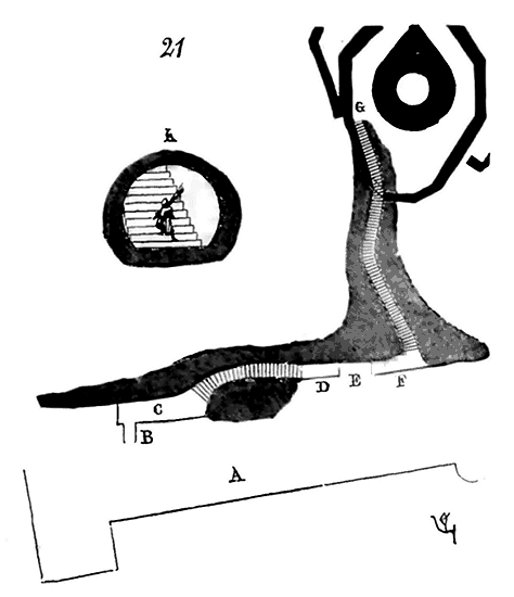 Voici donc (1) le profil de l'ouvrage de circonvallation. Les assaillants ne pouvant arriver au bord du premier fossé A qu'en gravissant une longue pente assez abrupte, étaient difficilement vus par les défenseurs placés en B; à plus forte raison se trouvaient-ils entièrement masqués pour les défenseurs postés le long du parapet C en dedans du deuxième fossé G. Ces défenseurs postés en C étaient cependant plus rapprochés de l'assaillant que ne l'étaient ceux postés en E sur les galeries réunissant les tours à trois étages, la ligne CO étant plus courte que la ligne EO. Des assaillants se présentant en K, à portée de trait, ne pouvaient atteindre les défenseurs postés derrière le parapet C, que s'ils envoyaient leurs projectiles en bombe suivant une ligne parabolique KL. Donc les clayonnages du chemin de ronde supérieur E protégeaient les soldats postés en C. César décrit très-bien les avantages de ses ouvrages en disant que les soldats placés en E voyaient l'ennemi de plus loin et pouvaient tirer sur lui sûrement. L'assaillant, gravissant la pente P, ne voit que le sommet des tours de bois et les galeries qui les réunissent; il n'a pas connaissance des deux fossés qui vont l'arrêter en O. Pendant qu'il gravit cette pente, il est exposé aux armes à longue portée de la défense supérieure; mais dès qu'il atteint la crête O, non-seulement il trouve deux obstacles devant lui s'il veut passer outre, mais il est exposé aux traits qui partent du chemin de ronde E et du rempart C, ces derniers traits pouvant être lancés directement, comme l'indique la ligne CO, mais aussi, en bombe, comme l'indique la parabole HM. En admettant que les troupes gravissant la pente K eussent été lancées, pleines d'ardeur, arrivant haletantes en O, il leur eût été bien difficile d'atteindre le vallum C. Cependant César, au camp du Mont-Saint-Pierre, ne craignait pas une attaque sérieuse des Bellovaques; au contraire, il cherchait à les attirer hors de leurs propres défenses. Lorsqu'il redoutait réellement une attaque, ses précautions étaient plus grandes encore. Autour d'Alesia, il établit des lignes de contrevallation et de circonvallation afin de bloquer l'armée de Vercingétorix renfermée dans cette ville, et de se mettre en défense contre les secours considérables qui menacent son camp. La ligne de contrevallation se compose: 1°, vers l'ennemi, d'un fossé large de vingt pieds, profond d'autant, et à fond de cuve. À quatre cents pieds en arrière de ce fossé, il établit ses retranchements. Dans l'intervalle, il fait creuser deux fossés de quinze pieds de large chacun et de quinze pieds de profondeur; le fossé intérieur est rempli d'eau au moyen de dérivations de la rivière; derrière ces fossés, il élève un rempart de douze pieds de haut, garni de parapets avec meurtrières. À la jonction du parapet et du rempart, il fait planter de forts palis fourchus pour empêcher l'escalade. Des tours, distantes entre elles de quatre-vingts pieds, flanquent tout le retranchement. Ces précautions, après quelques sorties des Gaulois, ne lui semblent pas suffisantes: il fait planter des troncs d'arbres ébranchés, écorcés et aiguisés, au fond d'une tranchée de cinq pieds de profondeur; cinq rangs de ces pieux sont attachés entre eux par le bas, de manière à ce qu'on ne puisse les arracher. Devant cet obstacle, il fait creuser des trous de loup coniques de trois pieds de profondeur, en quinconce, au fond desquels on enfonce des pieux durcis au feu et aiguisés qui ne sortent de terre que de quatre doigts; ces pieux sont fixés solidement en foulant le sol autour d'eux; des ronces les cachent aux regards. Les trous de loup sont disposés sur huit rangs, distants l'un de l'autre de trois pieds (2).