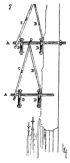 En avant sont fixés, très-rapprochés les uns des autres, des aiguillons, stimuli (3), d'un pied de long, armés de broches en fer. Dans un mémoire sur le blocus d'Alesia 550, M. le capitaine du génie Prévost nous paraît avoir parfaitement compris comment étaient façonnés les stimuli dont parle César. Parmi les objets antiques trouvés près d'Alise, dit le savant officier, on remarque des broches en fer, qui ont résolu pour lui la question des stimuli. Ces morceaux de fer ont 0,29 c. et un peu plus, c'est-à-dire qu'ils ont un pied romain; leur équarrissage au milieu est de 0,01 c.; ils sont cintrés en côte de vache et appointés par les deux bouts. «Tous les auteurs, ajoute M. Prévost, qui ont parlé des stimuli de César, ont cru qu'ils consistaient en un rondin de bois enfoncé en terre, avec une pointe en fer encastrée elle-même dans le piquet et surgissant au-dessus du sol. Quelque simple que soit cet objet, il est encore difficile à exécuter: on aurait fendu bien des rondins, en essayant d'y introduire de force une tige de fer; il aurait fallu ensuite appointer cette dernière en la limant à froid, ce qui eût demandé beaucoup de temps» (puis fallait-il avoir des limes); «on eût été obligé de frapper avec précaution sur la tête du piquet en bois pour l'enfoncer en terre sans risquer de le fendre. Toutes ces minuties sont très-appréciées de ceux qui ont l'occasion de faire exécuter rapidement de petits objets en nombre immense par les premiers individus venus 551. Rien n'est plus facile avec les broches trouvées à Alise: quelques forgerons les fabriquaient; ils faisaient aussi les petits crampons A, pareils à ceux avec lesquels nous attachons nos conducteurs sur les mandrins de bourrage des fourneaux de mine. On fixait à l'aide de deux de ces crampons la broche sur la paroi d'un rondin ayant un pied de long. Maintenu en C et en D, le fer ne pouvait glisser le long du bois dans aucun sens, puisqu'il avait son plus fort équarrissage au milieu...» et une courbure qui le forçait de se serrer fortement contre le bois. «Peut-être mettait-on deux ou trois broches pareilles autour du même piquet; dans ce dernier cas, il fallait, pour l'enfoncer en terre, frapper sur sa tête par l'intermédiaire d'un rondin recevant les coups de la masse; alors l'engin représentait encore mieux le hamus du texte latin.»