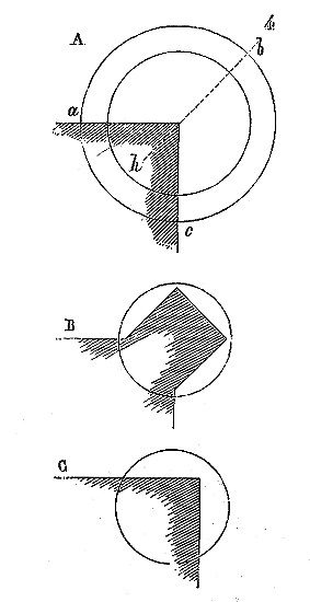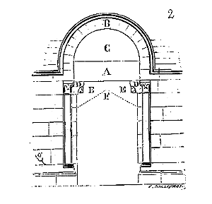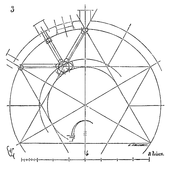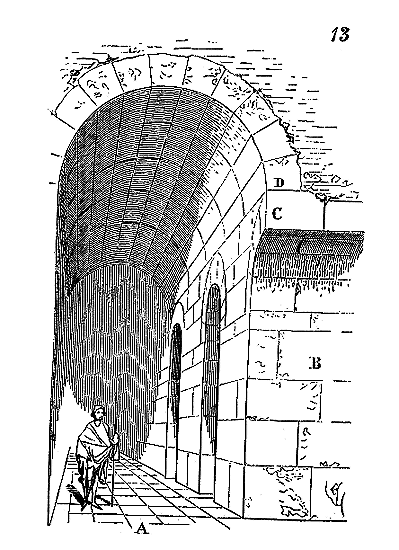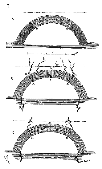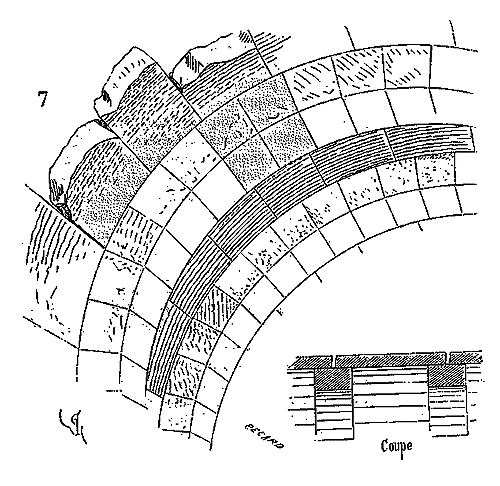 Il est facile de reconnaître qu'ici le praticien n'a pas eu d'autre idée que de simplifier son travail au moyen de ces divisions égales sur les deux arcs, de poser des rangs de moellons parallèles dans leur étendue, et d'éviter ainsi la taille de ces moellons sur le tas, exigée par le système français. Les conséquences de l'adoption de ce procédé simplificateur ne se firent pas attendre.