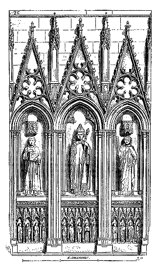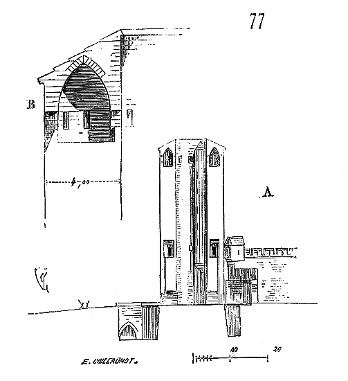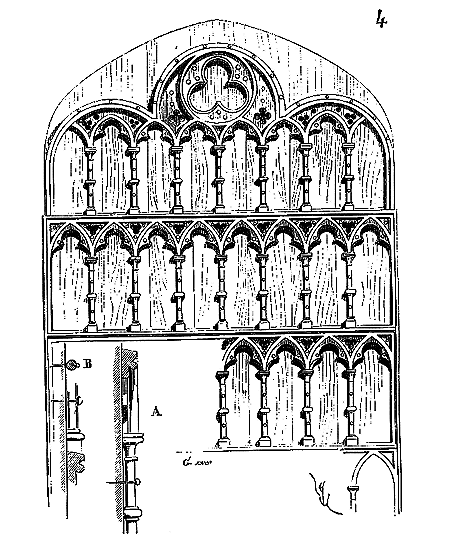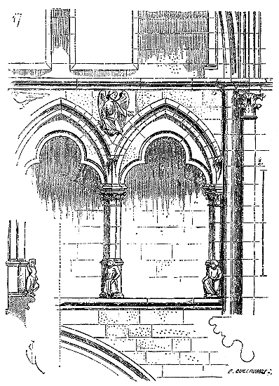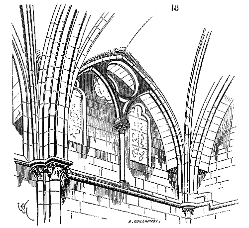 Note 402: (retour) C'est grâce à l'obligeance de M. Lance, architecte diocésain de Sens, et aux sondages intelligents faits par son inspecteur, M. Lefort, que nous avons pu relever exactement cette arcature, qui présente une disposition si curieuse. Dans notre restitution, la forme des fenêtres est seule douteuse, bien que les pieds-droits de ces fenêtres soient encore accusés à l'extérieur et coïncident avec les pieds-droits de l'arcature du triforium. (Voyez TRIFORIUM.)