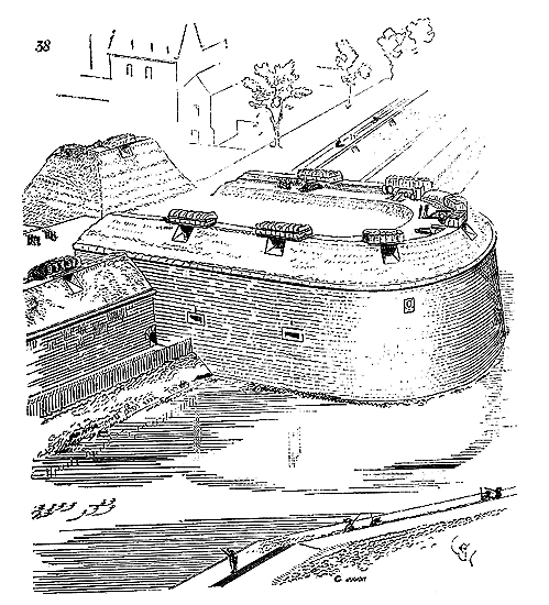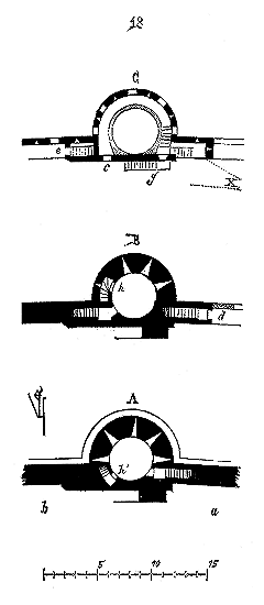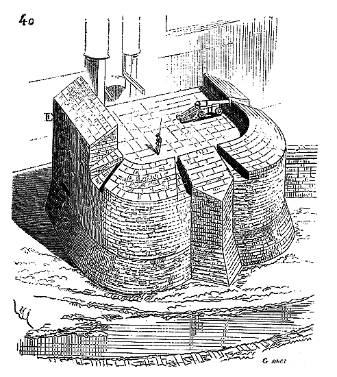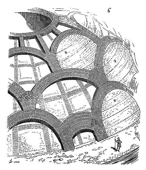 Ces sortes de voûtes sont très-plates. Ainsi la voûte dont la figure 40 présente l'extrados n'a, comme flèche, qu'un peu plus du quart de son diamètre. Cela seul indique les avantages que l'on pouvait tirer de ce mode de structure.