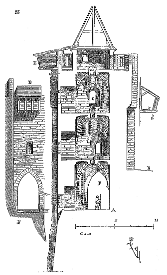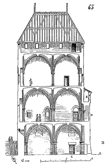 Le porche A était à claire-voie dans la partie inférieure, et vitré dans la partie supérieure. Cette disposition, adoptée fréquemment pour les cloîtres, produisait ici un effet très-pittoresque, ainsi que le remarque Sauval. Une coupe longitudinale (fig. 2) fera saisir la disposition originale de ces constructions ajoutées à la rotonde primitive.