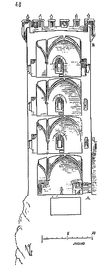 Cette chapelle (fig. 4) parait avoir été bâtie d'un seul jet, sauf l'abside, qui peut être quelque peu postérieure. Elle possède un porche ou narthex, avec tribune au-dessus, bâtie après coup, et qui était mise en communication avec les logis de la commanderie. Les murs de l'octogone ont trois pieds d'épaisseur, les contre-forts trois pieds de largeur. Une assise de bancs de pierre est disposée à la base des parois intérieures. Voici (fig. 5) la coupe longitudinale de cette chapelle. La voûte est construite à pans, avec nervures saillantes sous les arêtes rentrantes.