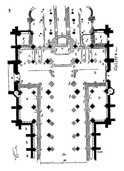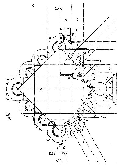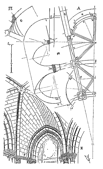 Note 406: (retour) Ce travail, inséré dans le premier volume des Transactions de l'Institut des architectes britanniques, a été traduit, en 1843, par M. Daly, dans la Revue d'architecture (t. IV). Le traducteur, dans l'introduction qui précède le texte de M. Willis, ne fait pas ressortir les différences profondes qui séparent la structure des voûtes anglaises de celle des voûtes françaises, et ne semble pas avoir étudié ces dernières; mais en 1843 personne n'était en état de se livrer à un travail critique sur cet objet.