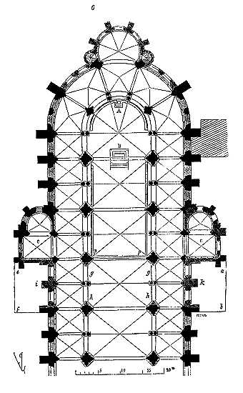 Nous avons cru nécessaire de nous étendre quelque peu sur les combinaisons qui ont amené les constructeurs anglais aux formes de voûtes en apparence si différentes des nôtres, bien que partant d'un même principe. Cette digression tend à démontrer que, d'un même principe, quand on le suit avec méthode, il peut sortir des déductions très-variées. Il est certain que du principe générateur de la voûte gothique on peut tirer d'autres conséquences encore; que par conséquent il ne peut y avoir aucune bonne raison pour repousser ce principe excellent en lui-même, et laissant à l'architecte la plus grande liberté quant aux applications qu'on en peut faire, en raison des programmes, de la nature des matériaux et de l'économie.