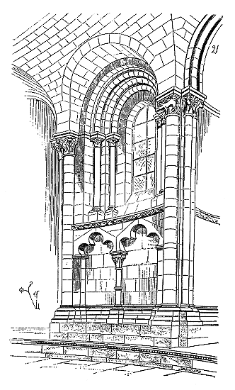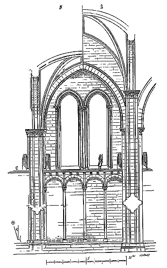 La figure 25 donne cette arcature à l'extérieur; les traces encore en place et de nombreux fragments permettent de la restituer sans difficultés 402. En perçant les nouvelles fenêtres, les architectes du XIIIe siècle se sont contentés de boucher les baies donnant autrefois sous le comble, et d'entailler les pieds-droits et archivoltes plein cintre suivant la courbe de l'archivolte de ces nouvelles baies. On voit encore en place, sur quelques points, les chapiteaux C, des portions d'archivoltes et toute la partie supérieure B. En A, sont les arrivées des arcs-boutants qui datent de la construction primitive. Cette arcature supérieure donnant au-dessus des voûtes se retrouve dans beaucoup d'églises romanes des provinces rhénanes, et avait pénétré jusque dans les parties orientales de la Champagne. Sa présence à Sens n'en est pas moins un fait assez remarquable.