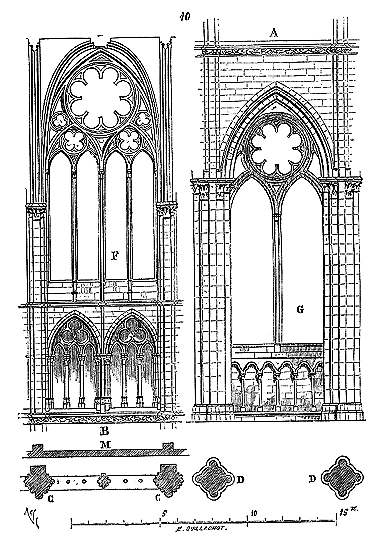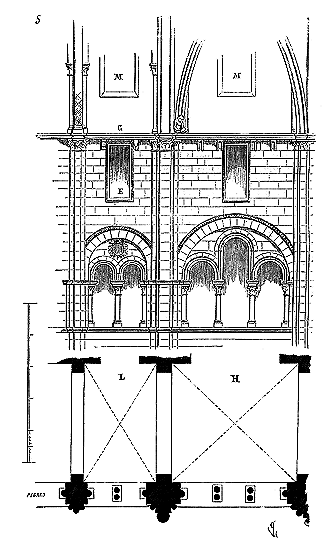 En A, est le plan horizontal de la naissance de ces grandes voûtes de la cathédrale de Sens. B est l'arc-doubleau; C, l'arc ogive; D, l'arc-doubleau de recoupement. En E, est tracée la coupe, suivant le grand axe, de cette portion de voûte. Les colonnettes c existent encore en place avec leurs chapiteaux, et dans les travées du choeur les branches be d'arcs formerets ont été laissées au-dessous des formerets surélevés à la fin du XIIIe siècle. Ces éléments suffiraient pour indiquer la hauteur et la forme précise des anciens formerets qu XIIe siècle. Mais voici qui vient encore appuyer notre restitution. Tout le long de la nef, la corniche F du XIIe siècle est conservée; au-dessous est une ornementation de petits arcs plein cintre qui reposent sur une arcature qui autrefois s'ouvrait nécessairement au-dessus des voûtes, ainsi que l'indique la coupe G. La corniche F était surélevée pour permettre aux entraits de la charpente de passer au-dessus de l'extrados des voûtes; et cette arcature G donnait du jour et de l'air sous le comble. Dans le choeur de l'église abbatiale de Vézelay, qui date de 1180 à 1190, les formerets sont également plein cintre et ainsi disposés en contre-bas des clefs de la voûte. Les voûtes hautes de l'église Notre-Dame de Châlons-sur-Marne possèdent, dans le choeur, des formerets plein cintre surbaissés. Il n'y a donc rien dans cette disposition qui ne soit conforme à la structure des voûtes des édifices voisins de Sens ou appartenant à la même province. La ligne ponctuée gh indique la place des formerets refaits à la fin du XIIIe siècle, formerets qui enveloppent de grandes fenêtres à meneaux dont les archivoltes viennent aujourd'hui pénétrer les restes de l'arcature autrefois ajourée au-dessus des voûtes.